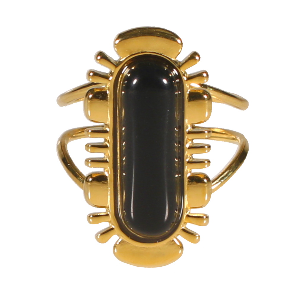 Description Bague en acier doré surmontée d'une véritable pierre d'onyx sertie clos. Taille ajustable. Largeur 25 mm Matière(s) Acier , Onyx , Pierre naturelle . L'acier utilisé dans la bijouterie existe sous plusieurs qualités. Nous utilisons principalement la qualité 316L, qualité qui est utilisée en chirurgie. Cet acier est donc inoxydable et reste très résistant. Couleur(s) dominante(s) Doré , Noir Public Adolescent , Adulte . Genre Femme , Fille . Saison Indémodable . Cliquez sur une matière, un thème, une couleur ou une collection pour voir tous les articles associés.