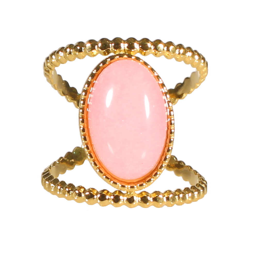 Bague en acier doré surmontée d'une véritable pierre de quartz rose sertie clos.