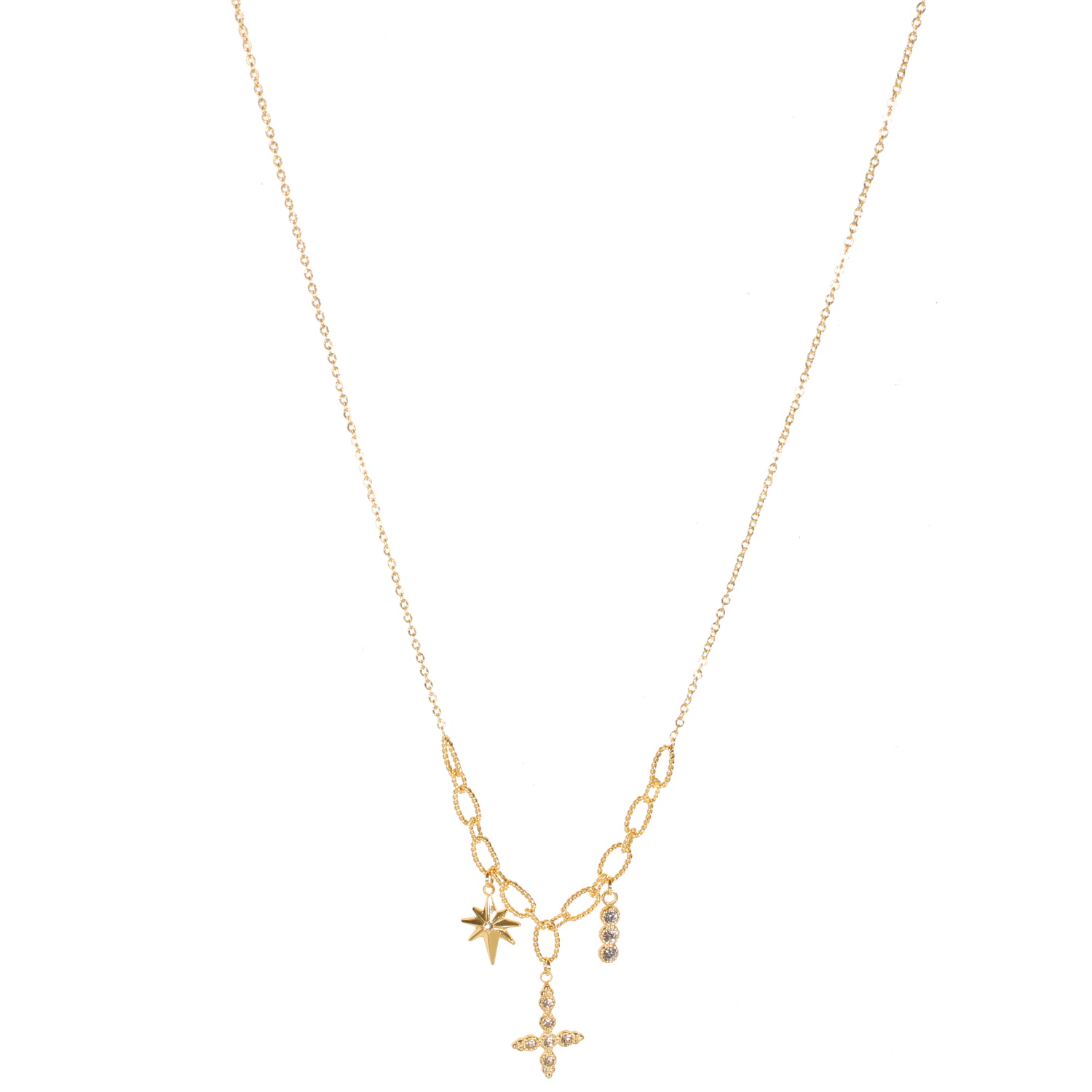 Collier composé d'une chaîne en acier doré et de trois pendentifs, une croix pavée de cristaux, une barre de trois cristaux sertis clos de forme ronde et une étoile sertie d'un cristal.