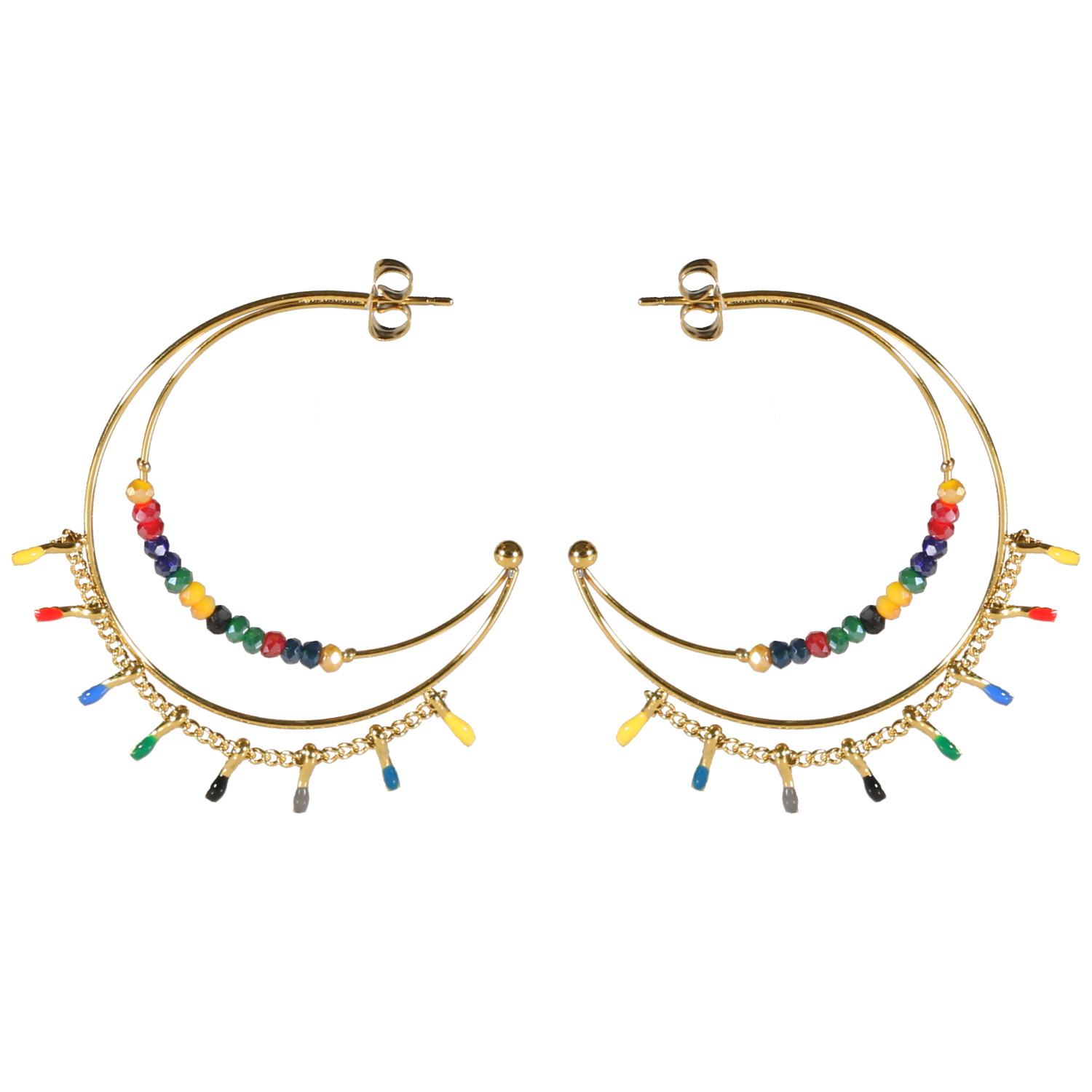 Boucles d'oreilles créoles double rangs en acier doré surmontées de perles de couleur et des pampilles pavées d'émail de couleur.