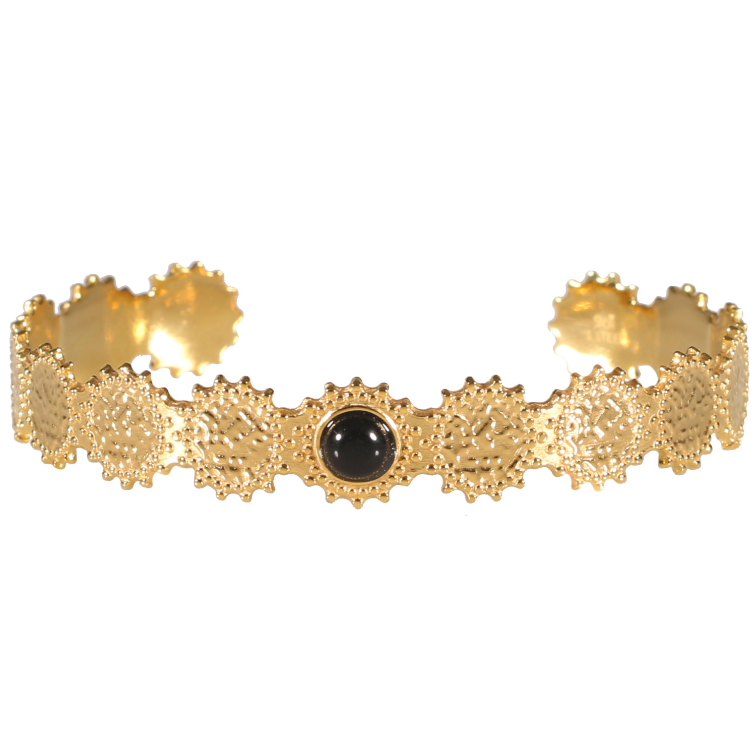 Description Bracelet jonc rigide composé de pastilles rondes martelées au motif de soleil en acier doré surmonté d'une pierre de couleur noire. Cliquez sur une matière, un thème, une couleur ou une collection pour voir tous les articles associés.