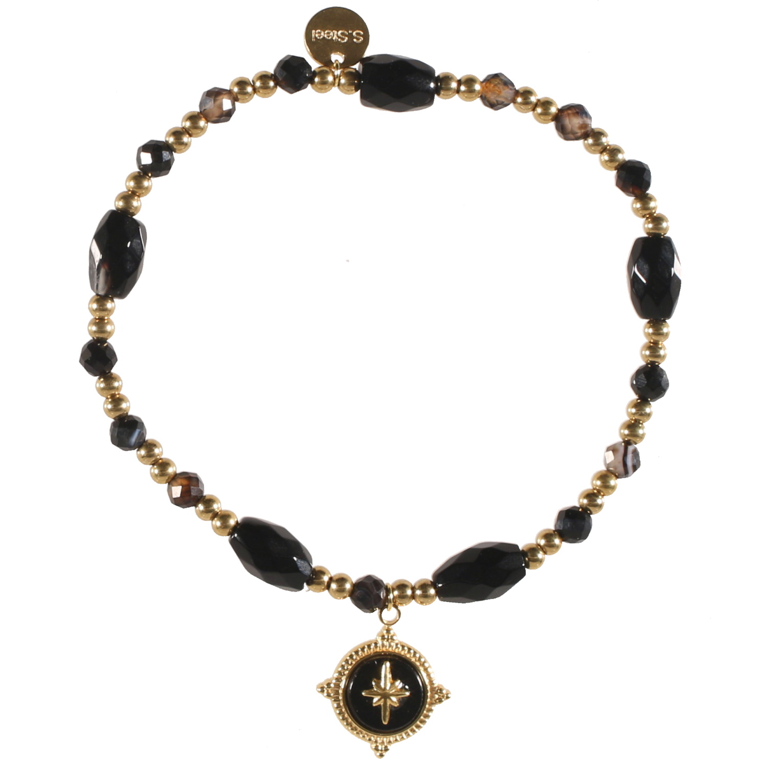 Bracelet élastique composé de perles en acier doré et perles en pierres de couleur et un pendant rond en acier doré surmonté d'une pastille en pierre de couleur et d'une étoile en acier doré.