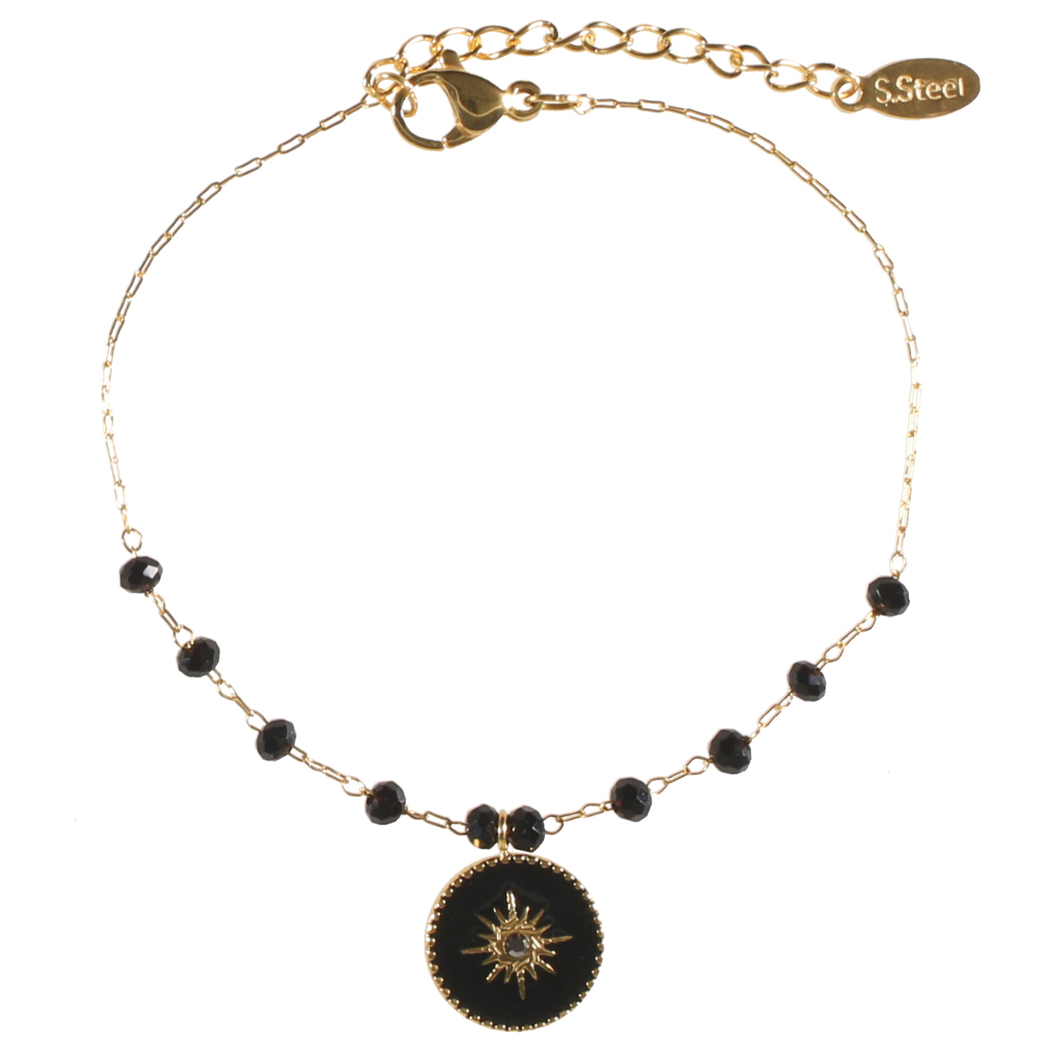 Bracelet composé d'une chaîne en acier doré surmontée de perles de couleur noire et d'un pendant rond pavé d'émail de couleur noire avec une étoile en acier doré surmontée d'un cristal.