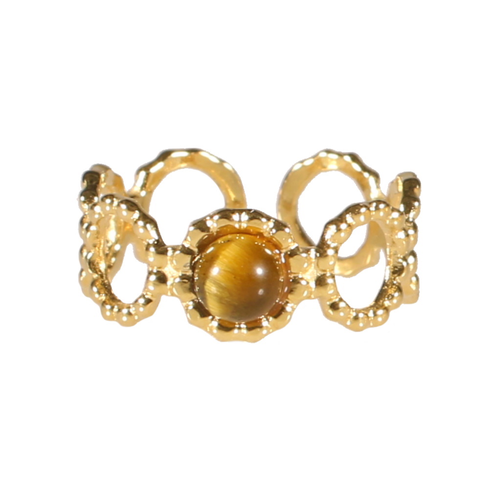 Bague au motif de chaîne en acier doré surmontée d'une véritable pierre d'œil de tigre sertie clos.