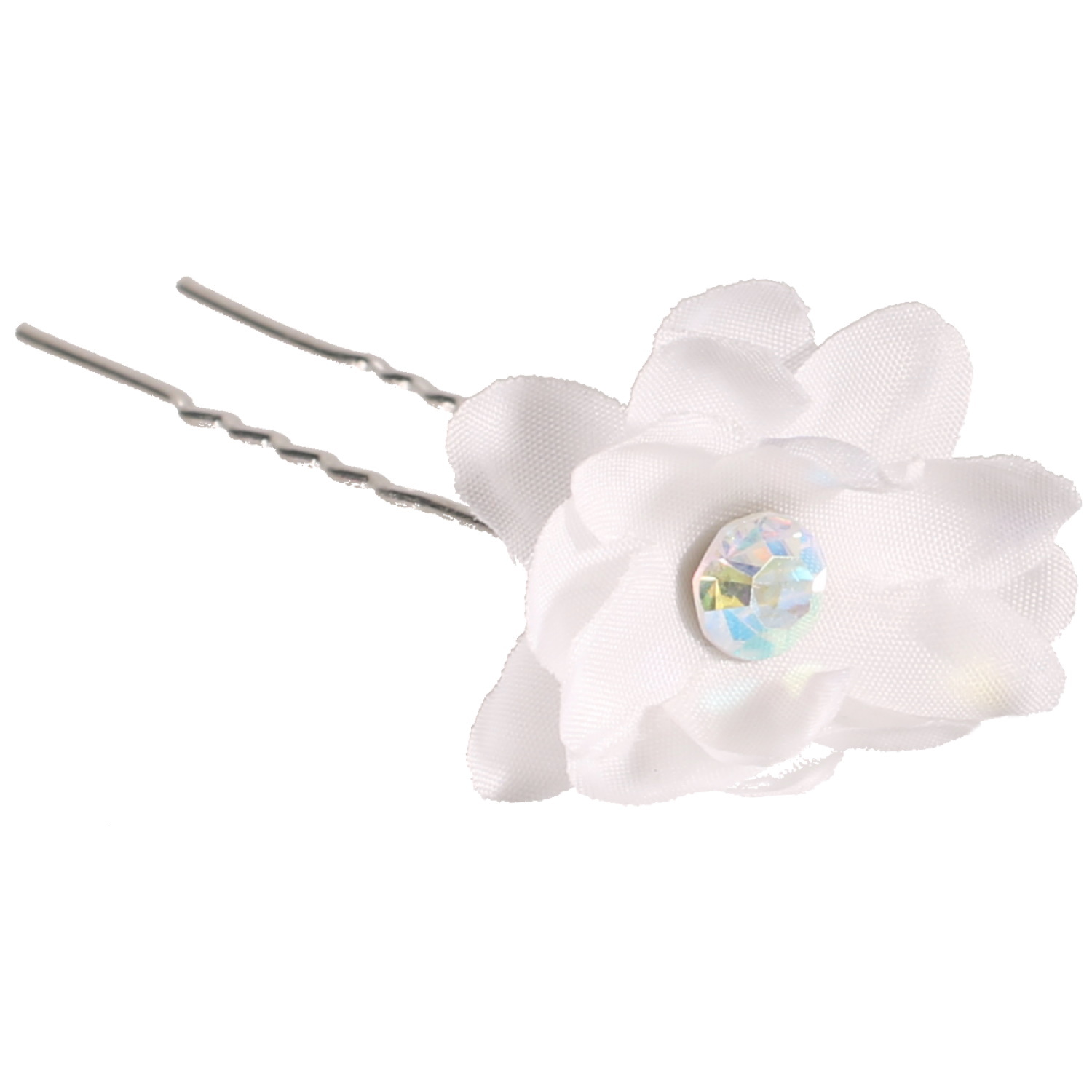 Invisible cheveux en métal argenté surmonté d'une fleur en textile et d'un cristal.