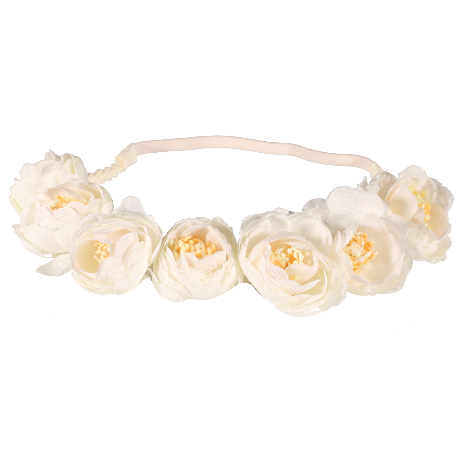 Bandeau avec cordon en suédine et textile élastique surmonté de fleurs et feuilles en textile et plastique.