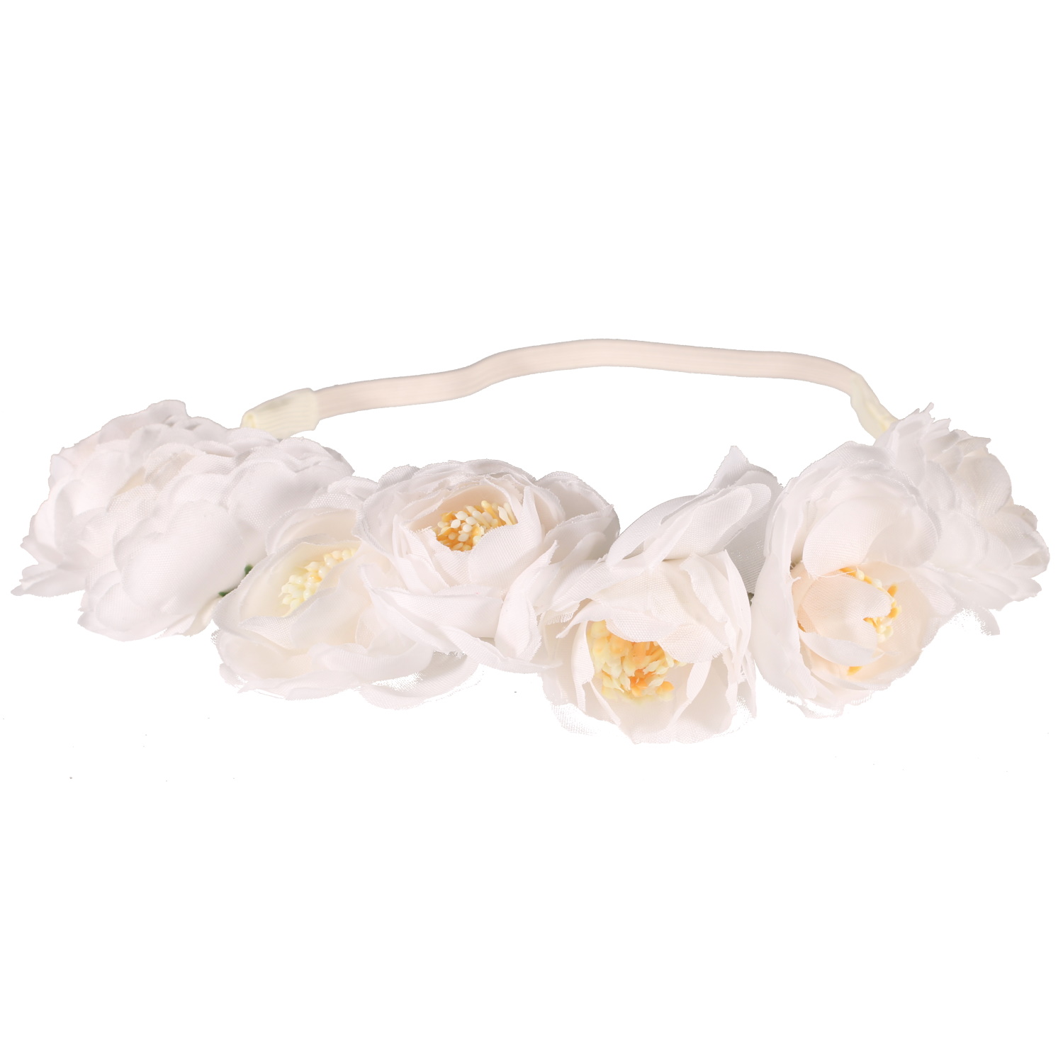 Bandeau avec cordon en suédine et textile élastique surmonté de fleurs et feuilles en textile et plastique.