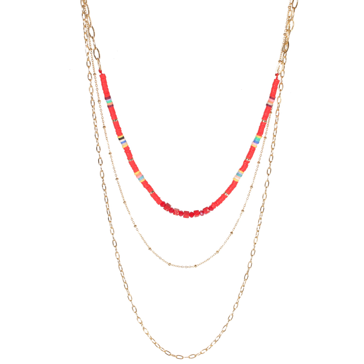 Collier triple rangs composé d'une chaîne de 38 cm de long en acier doré et perles cylindriques heishi en résine synthétique et caoutchouc de couleur rouge, une chaîne de 45 cm de long en acier doré, ainsi qu'une chaîne de 55 cm de long en acier doré.