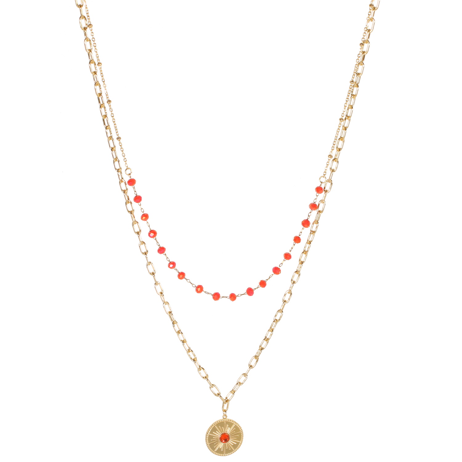 Description Collier double rangs composé d'une chaîne de 38 cm de long en acier doré avec perles de couleur rouge, ainsi qu'une chaîne de 45 cm de long en acier doré et un pendentif rond surmonté d'une pierre de couleur rouge. Fermoir mousqueton avec 5 cm de rallonge. Longueur 38+5 cm [Guide des tailles] Matière(s) Acier , Rocaille . L'acier utilisé dans la bijouterie existe sous plusieurs qualités. Nous utilisons principalement la qualité 316L, qualité qui est utilisée en chirurgie. Cet acier est donc inoxydable et reste très résistant. Fermoir Mousqueton À noter Pendentif 16 mm de diamètre Couleur(s) dominante(s) Doré , Rouge Public Adolescent , Adulte . Genre Femme , Fille . Saison Indémodable . Cliquez sur une matière, un thème, une couleur ou une collection pour voir tous les articles associés.