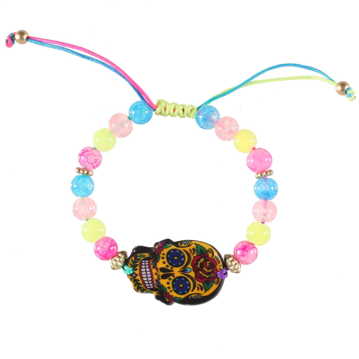 Bracelet fantaisie composé d'un cordon en textile avec perles de couleurs et une tête de mort avec dessins en émail de couleur.