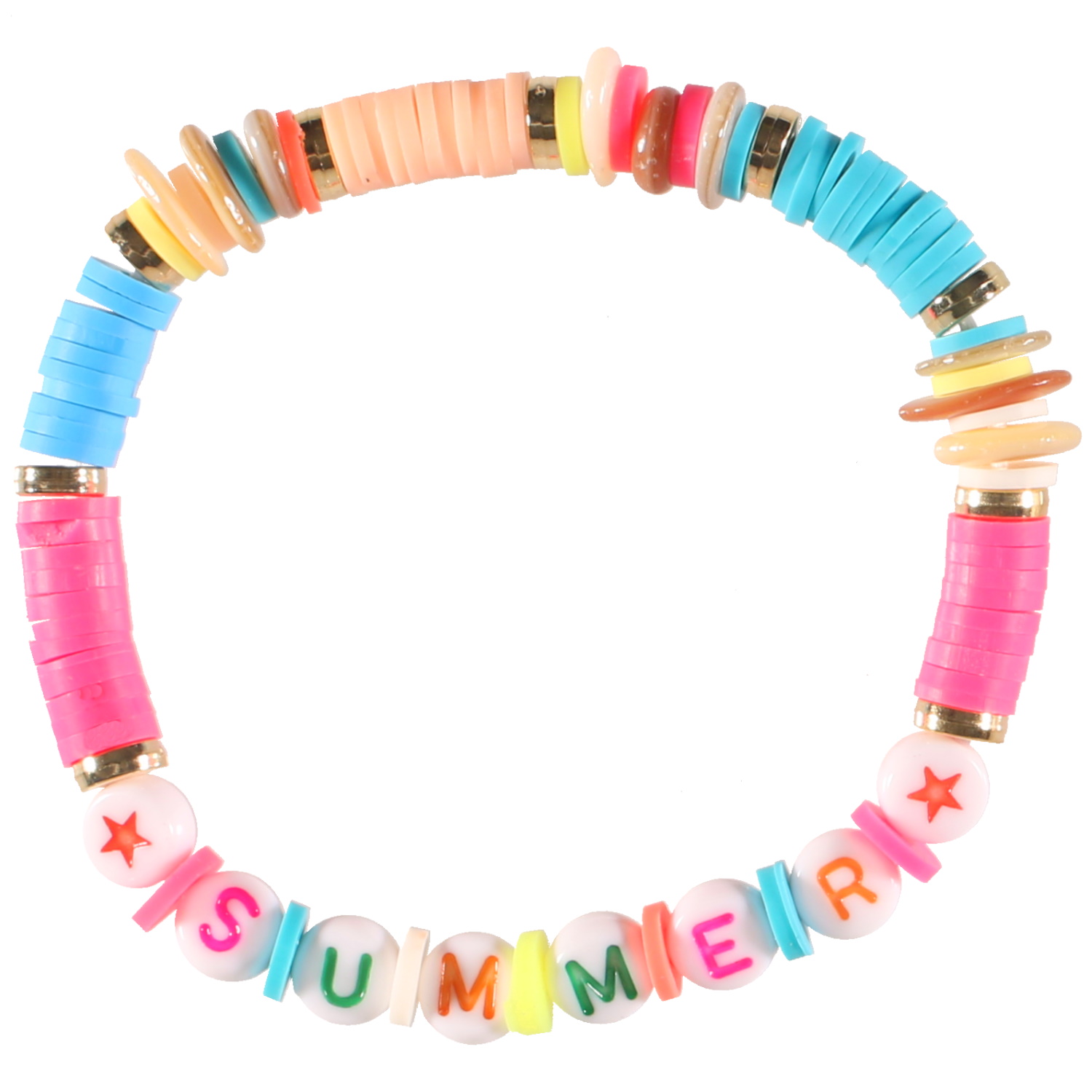 Bracelet fantaisie élastique composé de perles cylindriques heishi en résine synthétique et caoutchouc multicolore, ainsi que des perles rondes avec des lettres pour faire le mot SUMMER et dessin d'étoile.