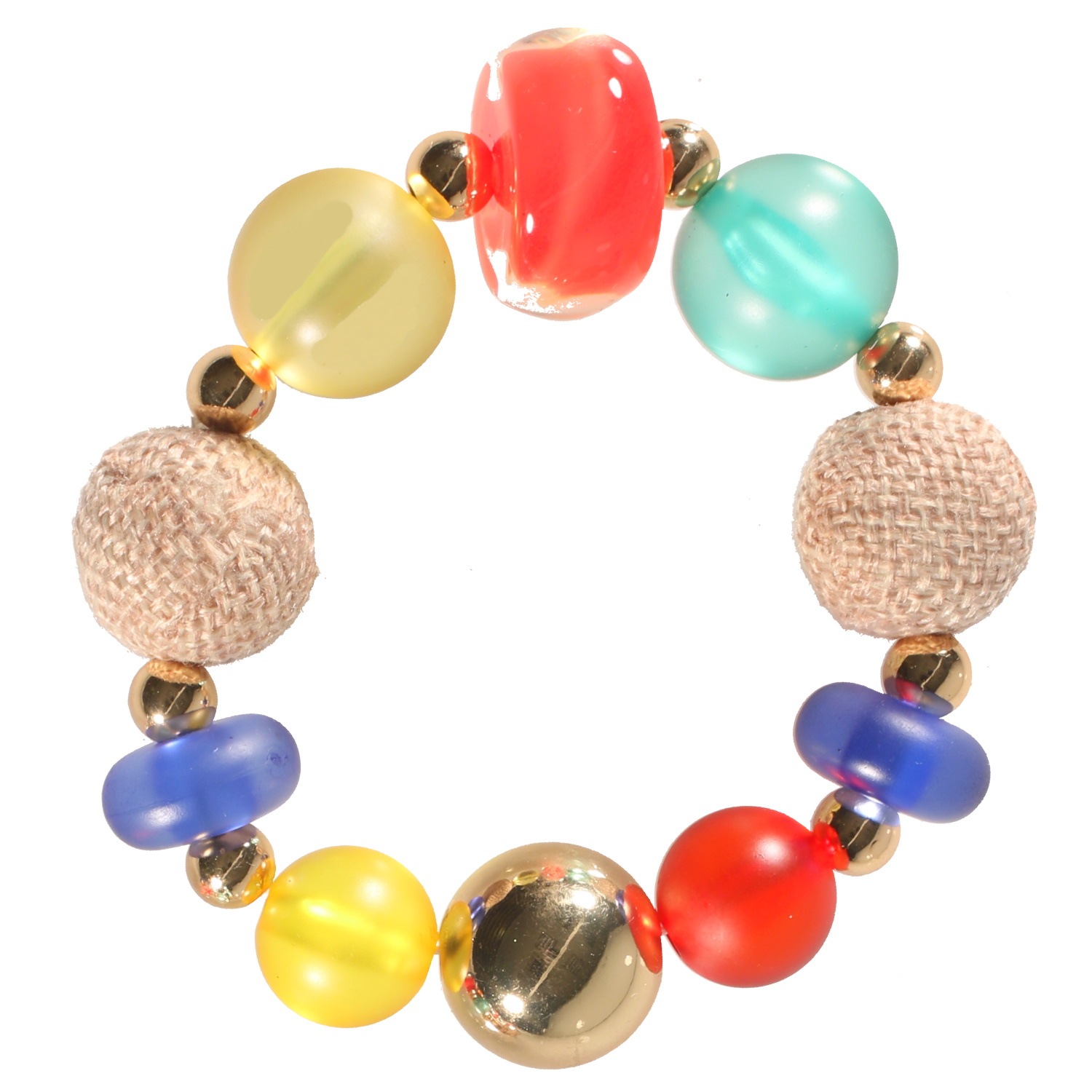 Bracelet fantaisie élastique composé de perles boules de couleur et boules recouvertes de textile.