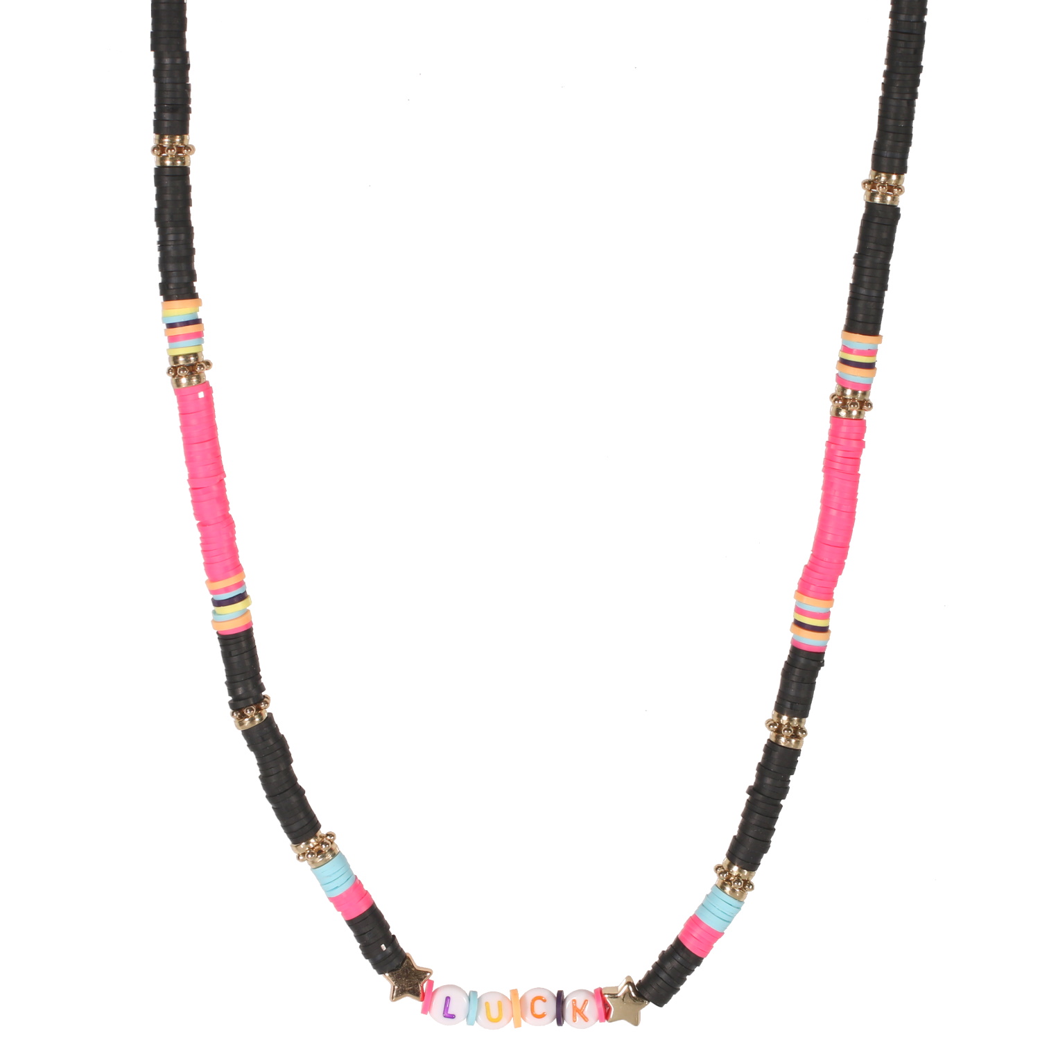 Collier fantaisie composé de perles cylindriques heishi en résine synthétique et caoutchouc multicolore, des étoiles en métal doré, ainsi que des perles rondes avec des lettres pour faire le mot LUCK.