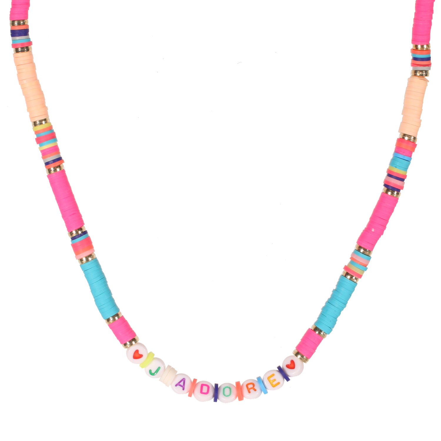 Collier fantaisie composé de perles cylindriques heishi en résine synthétique et caoutchouc multicolore, ainsi que des perles rondes avec des lettres pour faire le mot JADORE et dessins de coeur.