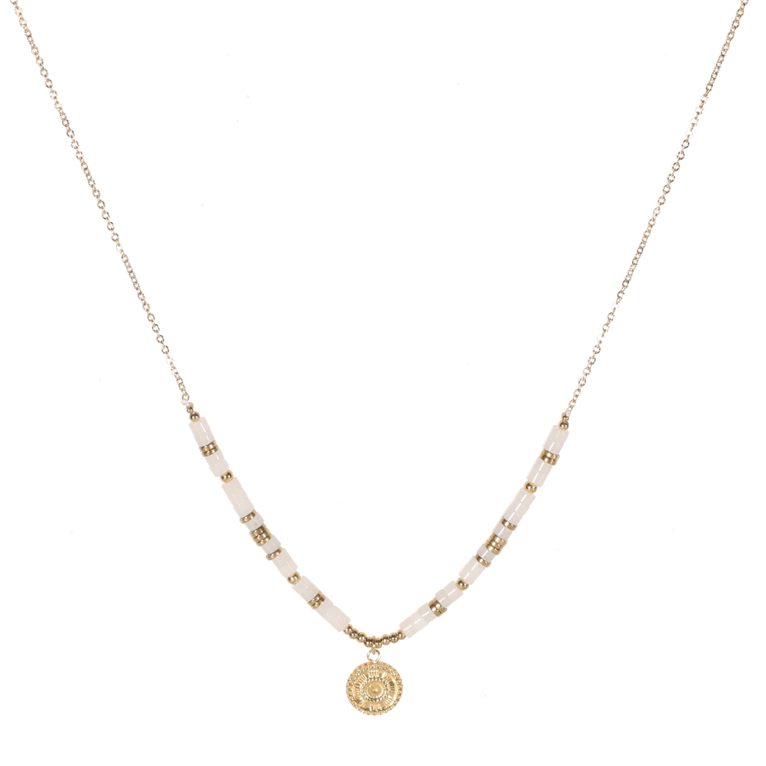 Collier composé d'une chaîne et d'un pendentif pastille ronde représentant le soleil en acier doré et de perles cylindriques en véritable pierre de lune.