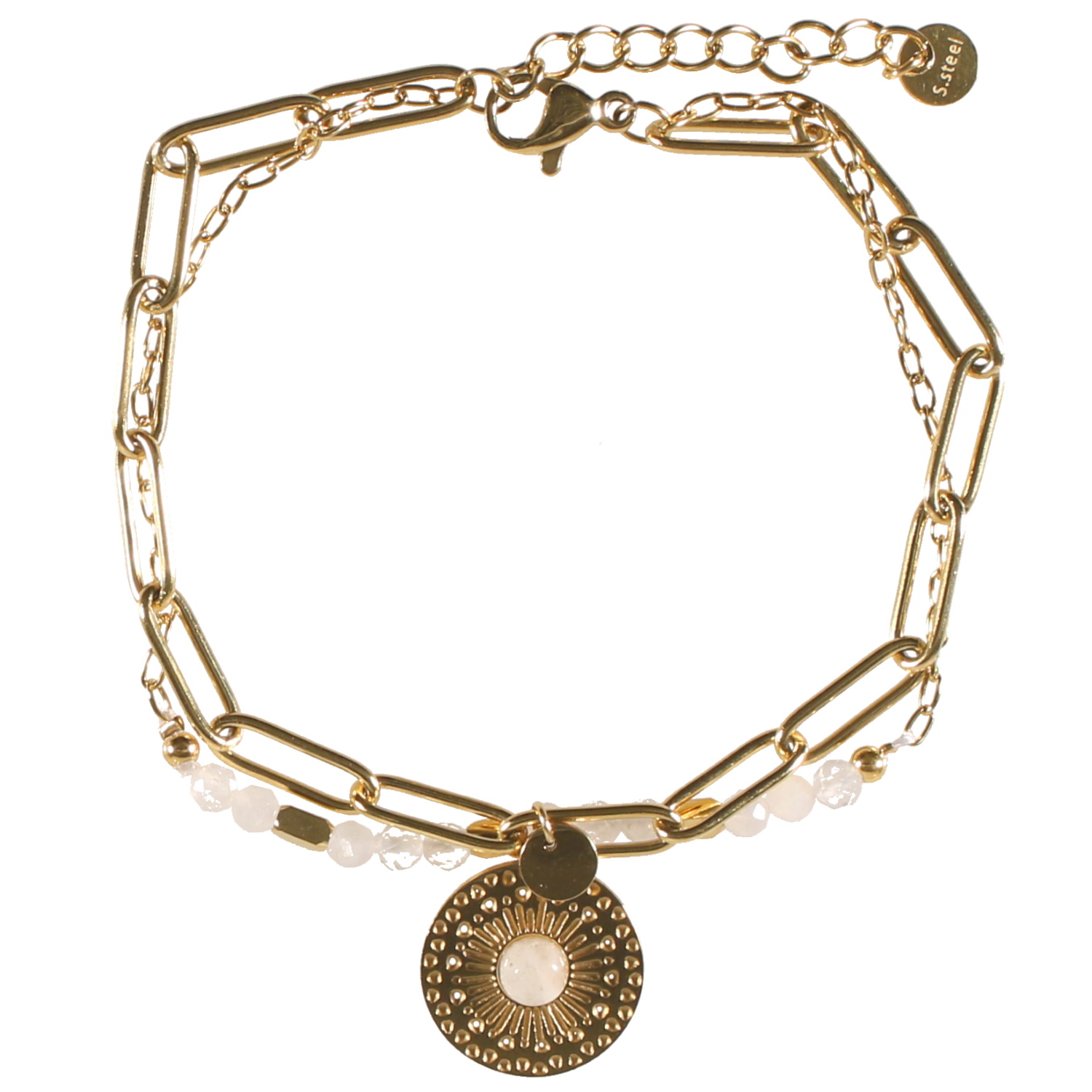 Bracelet double rangs composé d'une chaîne en acier doré surmontée de perles en véritable pierre de lune, ainsi qu'une chaîne en acier doré avec une pastille ronde pendante surmontée d'une véritable pierre de lune.