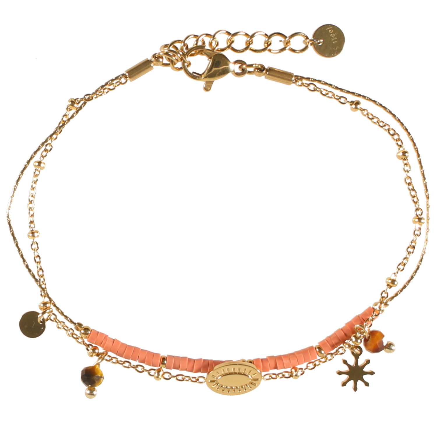 Bracelet double rangs composé d'une chaîne en acier doré surmontée de perles cylindriques en caoutchouc de couleur rouge, ainsi qu'une chaîne avec une pastille ovale représentant un œil de Turquie et des pendants étoile et pastille ronde en acier doré et de deux pampilles perles en véritable pierre œil de tigre.