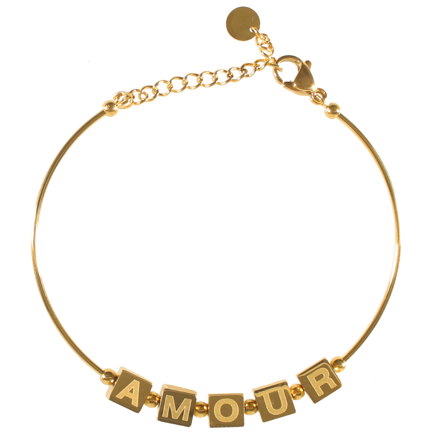 Description Bracelet jonc fil rond en acier doré avec 5 cubes composants le mot AMOUR. Fermoir mousqueton pour resserrer le jonc avec 4 cm de rallonge. Largeur 6 mm Diamètre 60 mm [Guide des tailles] Matière(s) Acier . L'acier utilisé dans la bijouterie existe sous plusieurs qualités. Nous utilisons principalement la qualité 316L, qualité qui est utilisée en chirurgie. Cet acier est donc inoxydable et reste très résistant. Fermoir Mousqueton Couleur(s) dominante(s) Doré Public Adolescent , Adulte . Genre Femme , Fille . Saison Indémodable . Thème(s) Amour , Message . Cliquez sur une matière, un thème, une couleur ou une collection pour voir tous les articles associés.