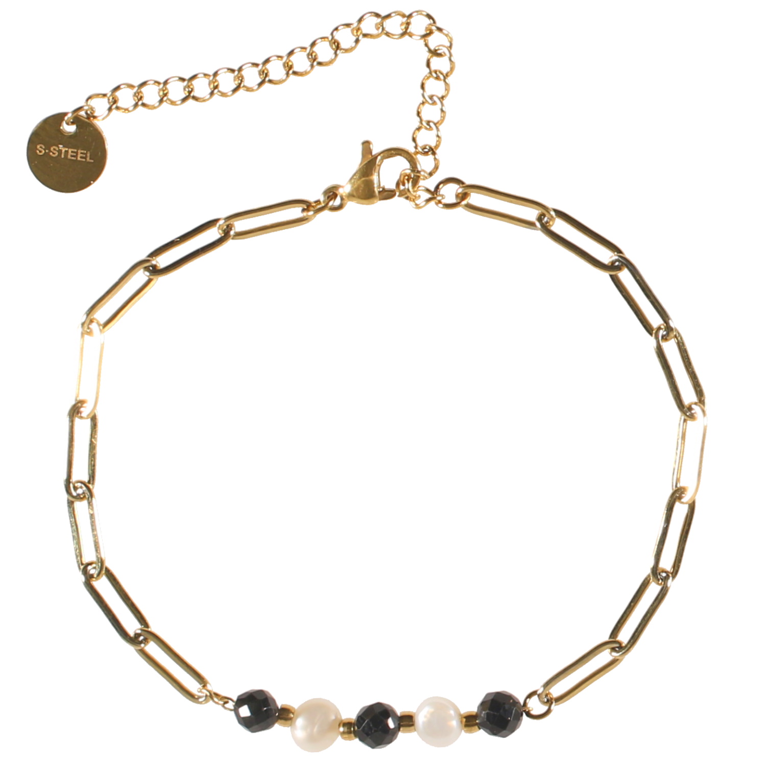 Bracelet composé d'une chaîne en acier doré, de trois perles de couleur noire et de deux perles de nacre.
