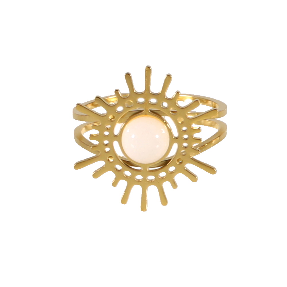 Description Bague avec rayons en acier doré surmontée d'une pierre de couleur blanche. Taille ajustable. Largeur 19 mm Matière(s) Acier , Rocaille . L'acier utilisé dans la bijouterie existe sous plusieurs qualités. Nous utilisons principalement la qualité 316L, qualité qui est utilisée en chirurgie. Cet acier est donc inoxydable et reste très résistant. Fermoir Aucun Couleur(s) dominante(s) Blanc , Doré Public Adolescent , Adulte . Genre Femme , Fille . Saison Indémodable . Cliquez sur une matière, un thème, une couleur ou une collection pour voir tous les articles associés.