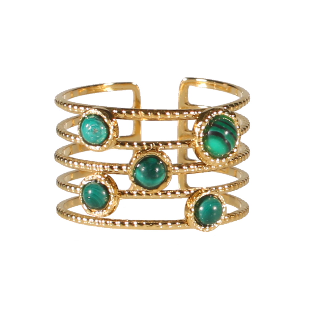 Bague composée de 5 rangs en acier doré surmontée de 5 véritables pierres de malachite serties clos.