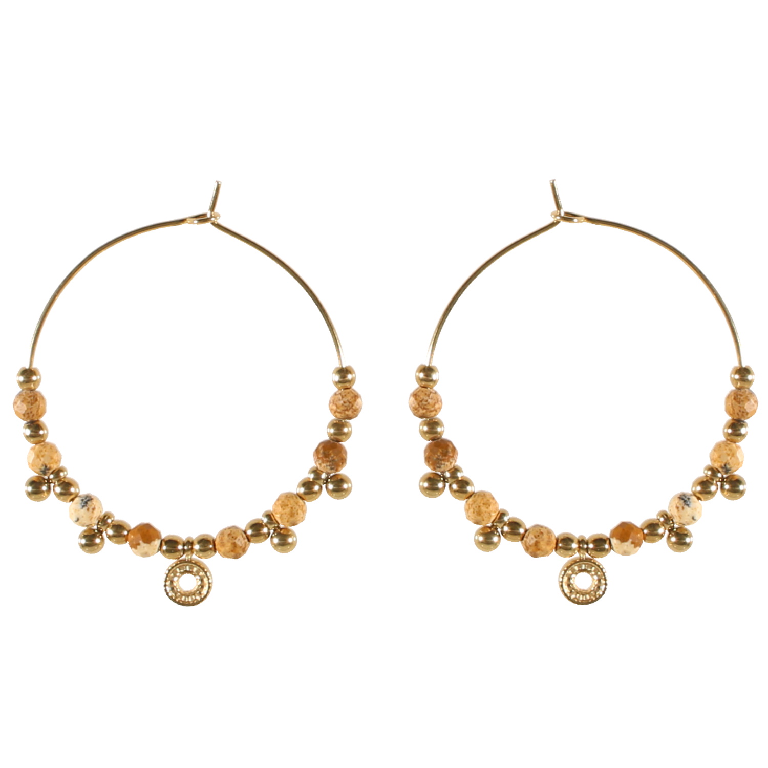 Boucles d'oreilles créoles avec pendant cercle en acier doré surmontées de perles en véritable pierre de jaspe paysage.
