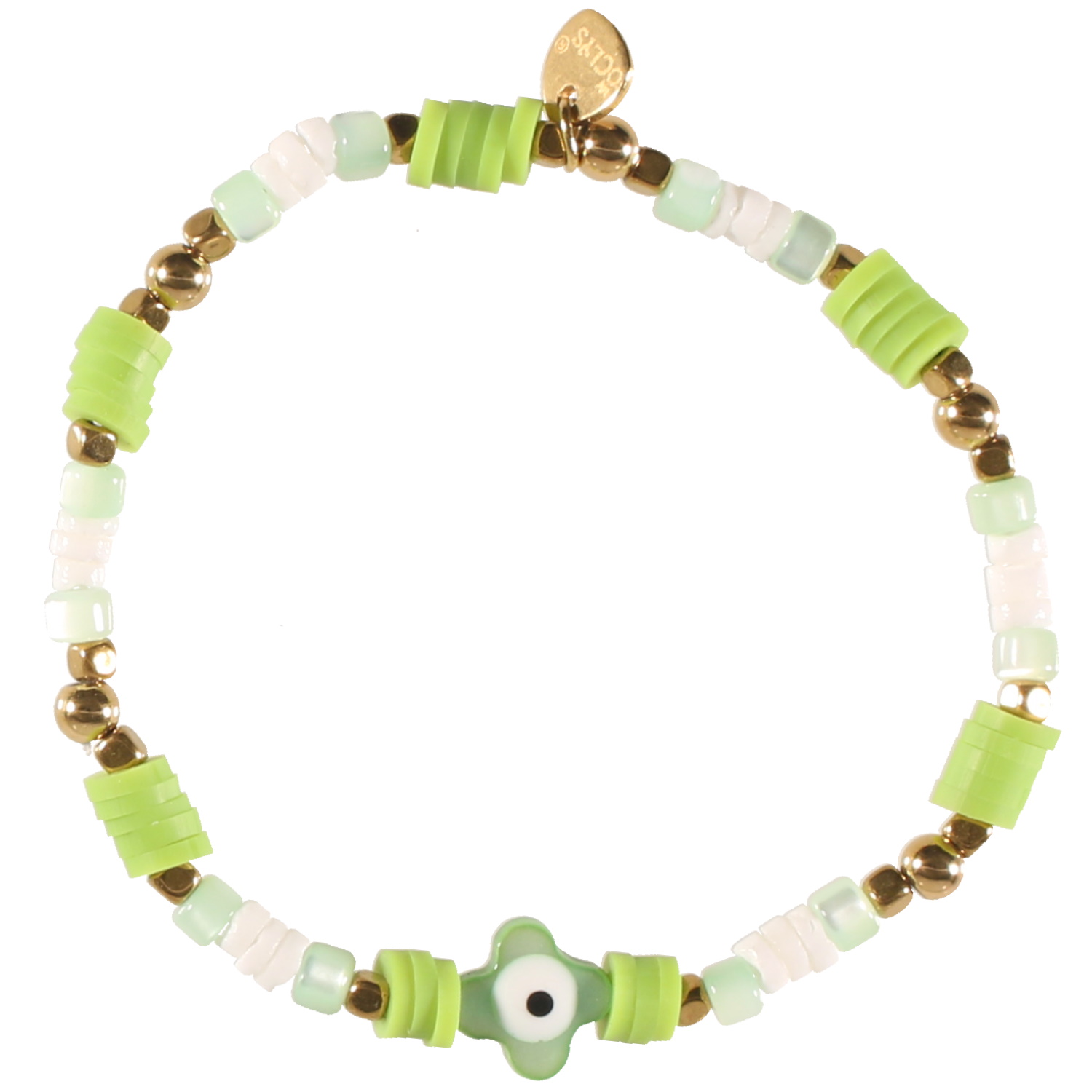 Bracelet élastique composé de perles en acier doré, de perles cylindriques heishi en résine synthétique et en caoutchouc de couleur acidulée, ainsi qu'un œil de Turquie en nacre et émail.