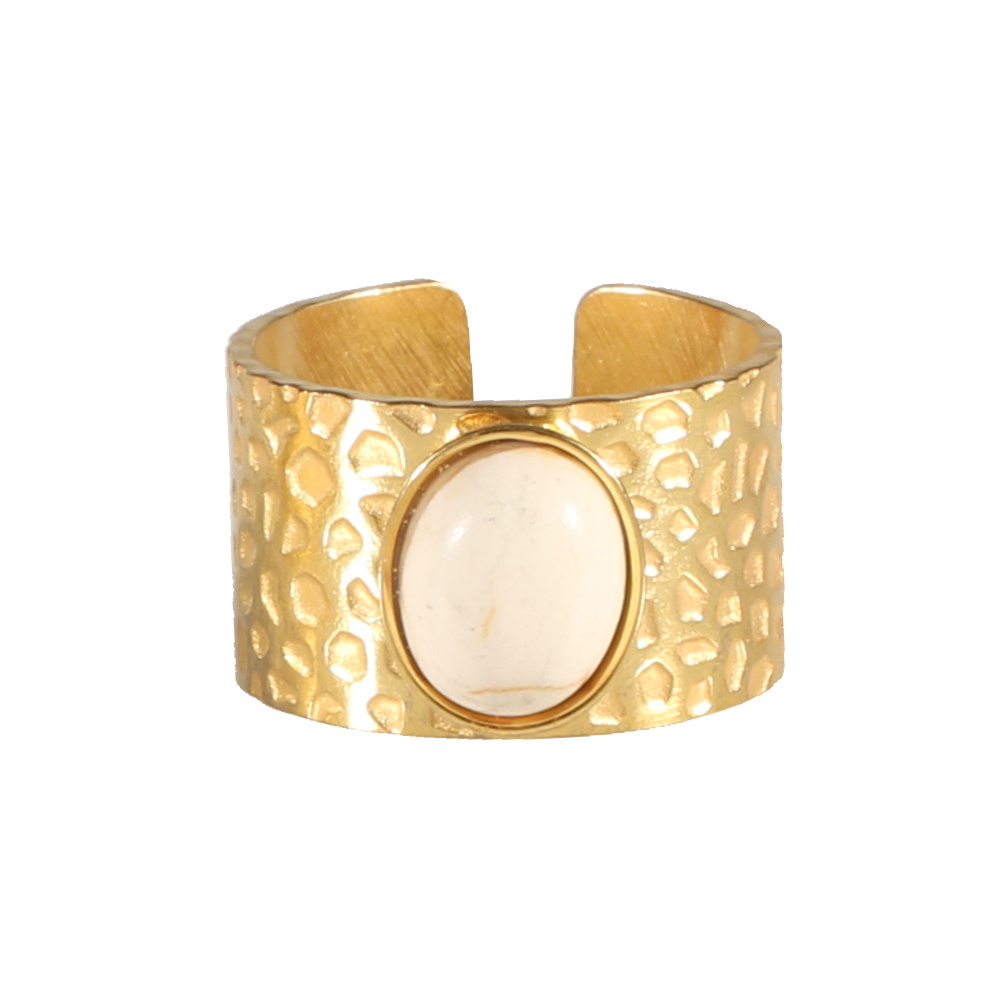 Description Bague en acier doré martelé surmontée d'une pierre de couleur blanche sertie clos de forme ovale. Taille ajustable. Largeur 12 mm Matière(s) Acier , Rocaille . L'acier utilisé dans la bijouterie existe sous plusieurs qualités. Nous utilisons principalement la qualité 316L, qualité qui est utilisée en chirurgie. Cet acier est donc inoxydable et reste très résistant. Fermoir Aucun Couleur(s) dominante(s) Blanc , Doré Public Adolescent , Adulte . Genre Femme , Fille . Saison Indémodable . Cliquez sur une matière, un thème, une couleur ou une collection pour voir tous les articles associés.