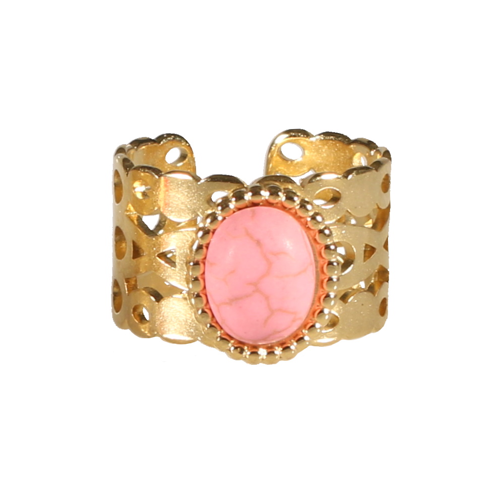 Description Bague aux motifs ajourés en acier doré surmontée d'une pierre de couleur rose sertie clos de forme ovale. Taille ajustable. Largeur 14 mm Matière(s) Acier , Rocaille . L'acier utilisé dans la bijouterie existe sous plusieurs qualités. Nous utilisons principalement la qualité 316L, qualité qui est utilisée en chirurgie. Cet acier est donc inoxydable et reste très résistant. Fermoir Aucun Couleur(s) dominante(s) Doré , Rose Public Adolescent , Adulte . Genre Femme , Fille . Saison Indémodable . Cliquez sur une matière, un thème, une couleur ou une collection pour voir tous les articles associés.