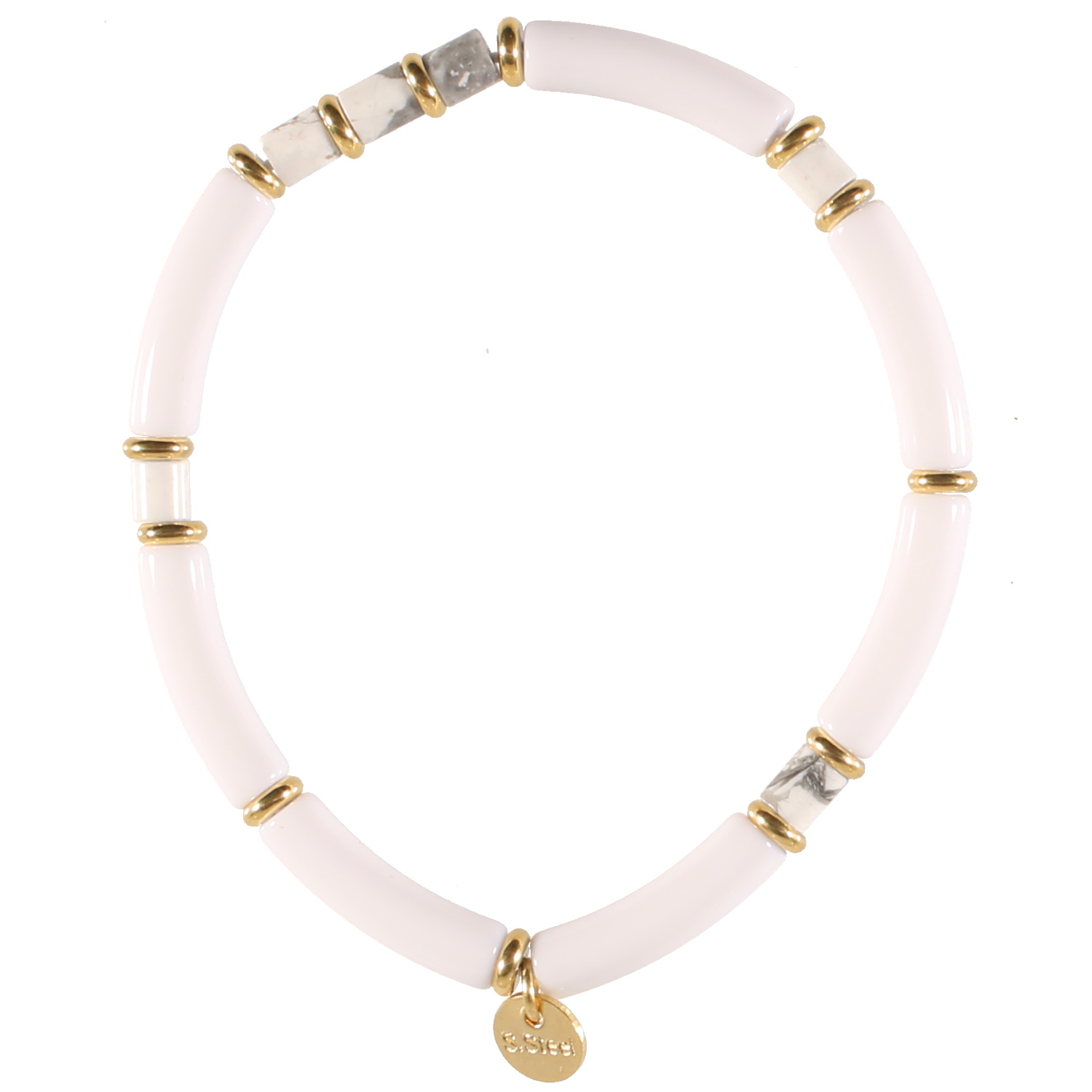Description Bracelet élastique composé d'un fil nylon avec des perles cylindriques en acier doré, des perles cylindriques en pierre de couleur blanche et des tubes de couleur blanche. Longueur 17 cm [Guide des tailles] Largeur 5 mm Matière(s) Acier , Rocaille . L'acier utilisé dans la bijouterie existe sous plusieurs qualités. Nous utilisons principalement la qualité 316L, qualité qui est utilisée en chirurgie. Cet acier est donc inoxydable et reste très résistant. Fermoir Aucun Couleur(s) dominante(s) Blanc , Doré Public Adolescent , Adulte . Genre Femme , Fille . Saison Indémodable . Cliquez sur une matière, un thème, une couleur ou une collection pour voir tous les articles associés.