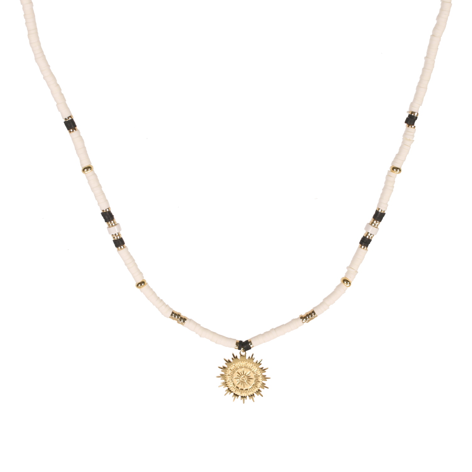 Collier composé de perles heishi en acier doré et en caoutchouc multicolore et d'un pendentif en forme de soleil en acier doré.