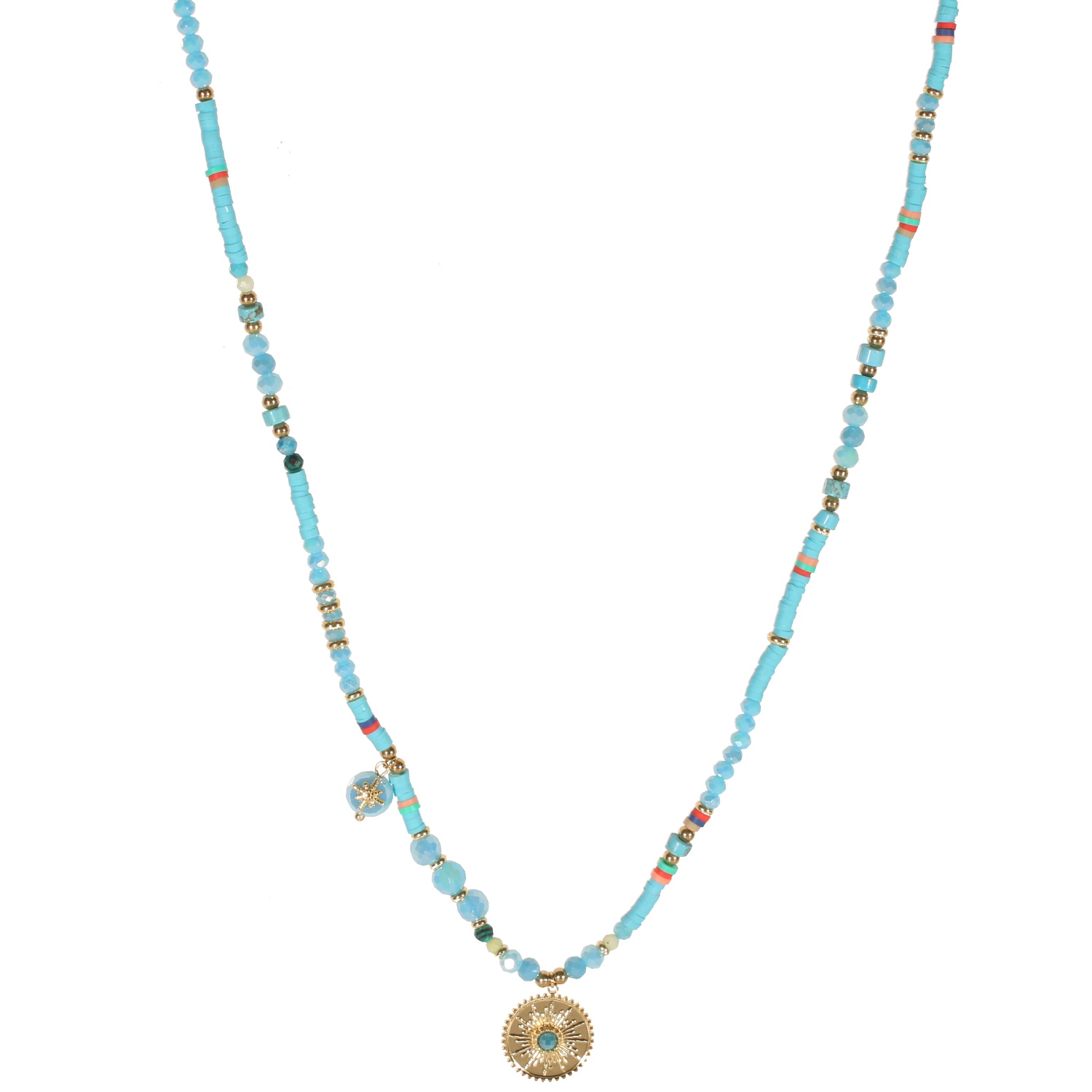 Collier sautoir composé de perles heishi en acier doré et en caoutchouc multicolore, de perles multicolores, d'un pendant en pierre de couleur bleue surmontée d'une étoile en acier doré et d'un pendentif rond représentant un soleil en acier doré surmonté d'un cristal de couleur bleu serti clos.