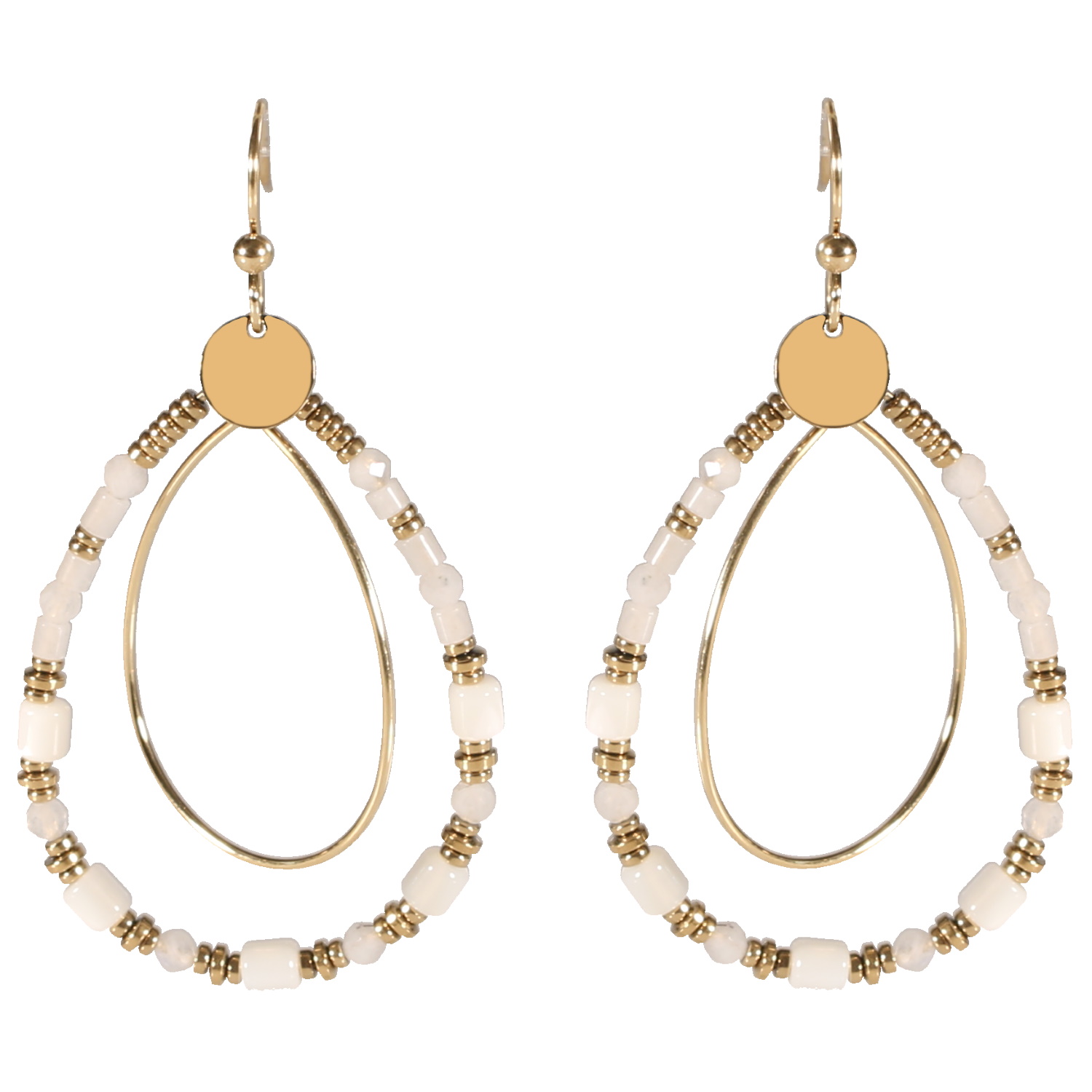 Boucles d'oreilles pendantes composées d'une pastille ronde et d'un cercle ovale en acier doré, d'un cercle ovale surmonté de perles en acier doré et perles de couleur blanche.