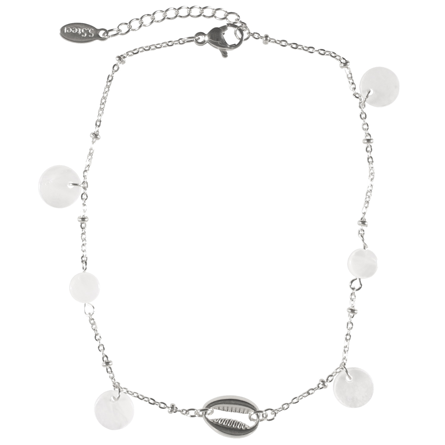 Bracelet chaîne de cheville composé d'une chaîne avec coquillage cauri en acier argenté et de pampilles rondes de nacre.<br/>Fermoir mousqueton avec 3 cm de rallonge. Cheville Coquillage Rond  Adolescent Adulte Femme Fille Indémodable Nature Bracelet chaîne de cheville composé d'une chaîne avec coquillage cauri en acier argenté et de pampilles rondes de nacre.<br/>Fermoir mousqueton avec 3 cm de rallonge. Cheville Coquillage Rond  Adolescent Adulte Femme Fille Indémodable Nature
