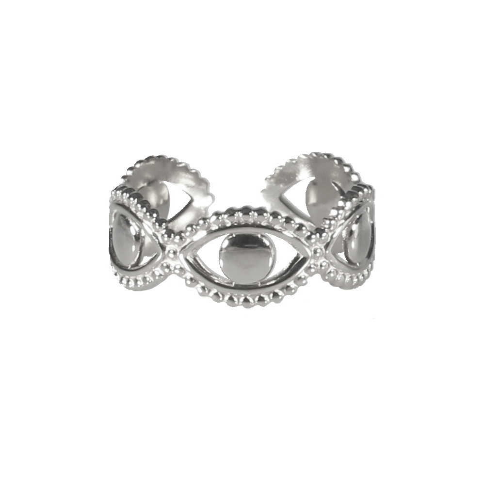 Description Bague composée d'œil de Turquie en acier argenté. Taille ajustable. Largeur 8 mm Matière(s) Acier . L'acier utilisé dans la bijouterie existe sous plusieurs qualités. Nous utilisons principalement la qualité 316L, qualité qui est utilisée en chirurgie. Cet acier est donc inoxydable et reste très résistant. Fermoir Aucun Couleur(s) dominante(s) Argenté Public Adolescent , Adulte . Genre Femme , Fille . Saison Indémodable . Thème(s) Symboles . Cliquez sur une matière, un thème, une couleur ou une collection pour voir tous les articles associés.