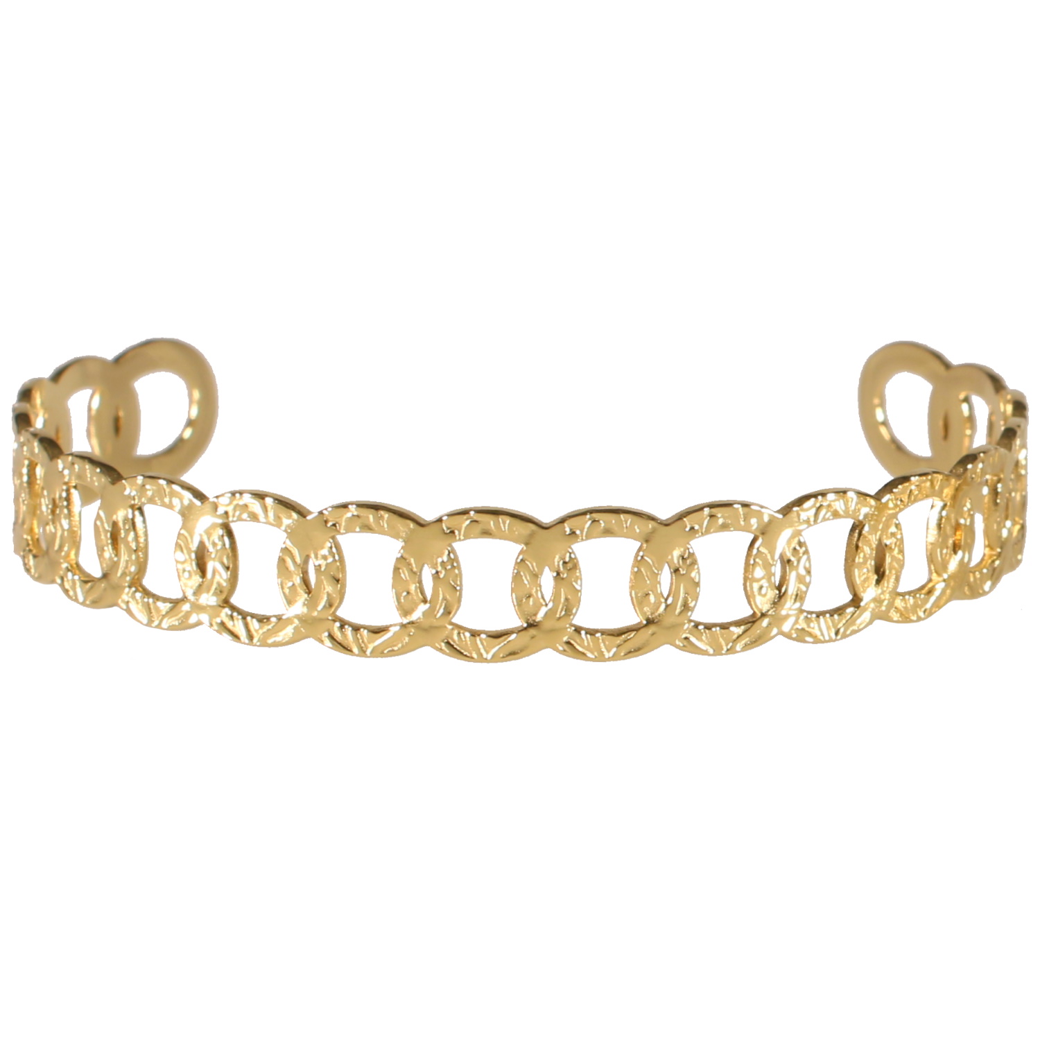 Description Bracelet jonc ouvert en forme de chaîne en acier doré. Largeur 10 mm Diamètre 66 mm [Guide des tailles] Matière(s) Acier . L'acier utilisé dans la bijouterie existe sous plusieurs qualités. Nous utilisons principalement la qualité 316L, qualité qui est utilisée en chirurgie. Cet acier est donc inoxydable et reste très résistant. Fermoir Aucun Couleur(s) dominante(s) Doré Public Adolescent , Adulte . Genre Femme , Fille . Saison Indémodable . Collection Christine Cliquez sur une matière, un thème, une couleur ou une collection pour voir tous les articles associés.
