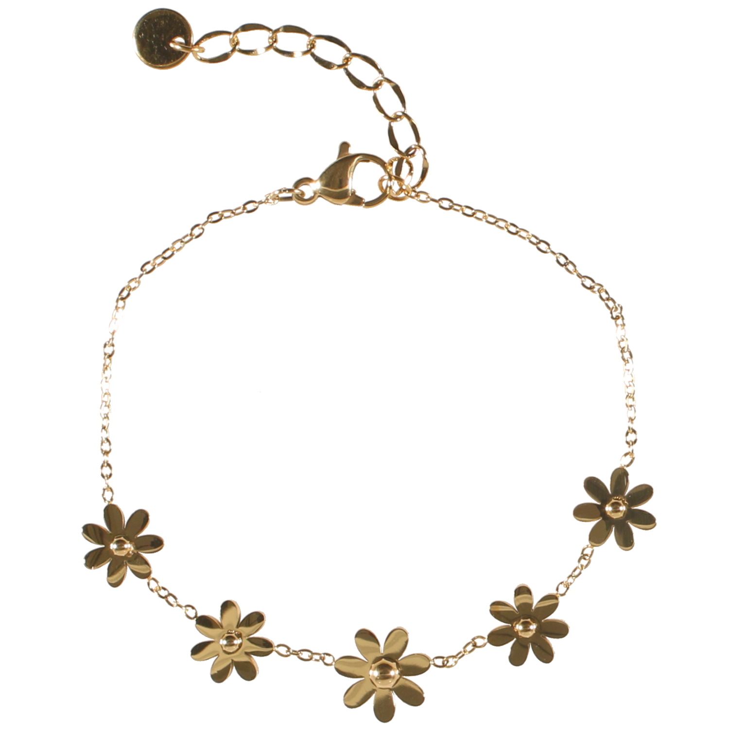 Description Bracelet composé d'une chaîne avec 5 fleurs en acier doré. Fermoir mousqueton avec 3 cm de rallonge. Longueur 16+3 cm [Guide des tailles] Largeur 10 mm Matière(s) Acier . L'acier utilisé dans la bijouterie existe sous plusieurs qualités. Nous utilisons principalement la qualité 316L, qualité qui est utilisée en chirurgie. Cet acier est donc inoxydable et reste très résistant. Fermoir Mousqueton Couleur(s) dominante(s) Doré Public Adolescent , Adulte . Genre Femme , Fille . Saison Indémodable . Thème(s) Fleurs , Nature . Cliquez sur une matière, un thème, une couleur ou une collection pour voir tous les articles associés.