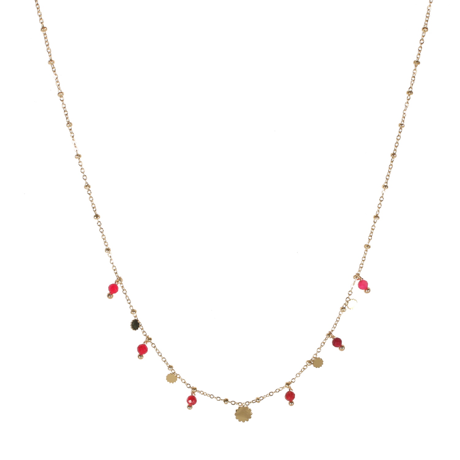 Description Collier composé d'une chaîne avec pampilles en forme de fleurs en acier doré et de pampilles perles de couleur rouge. Fermoir mousqueton avec 5 cm de rallonge. Cliquez sur une matière, un thème, une couleur ou une collection pour voir tous les articles associés.