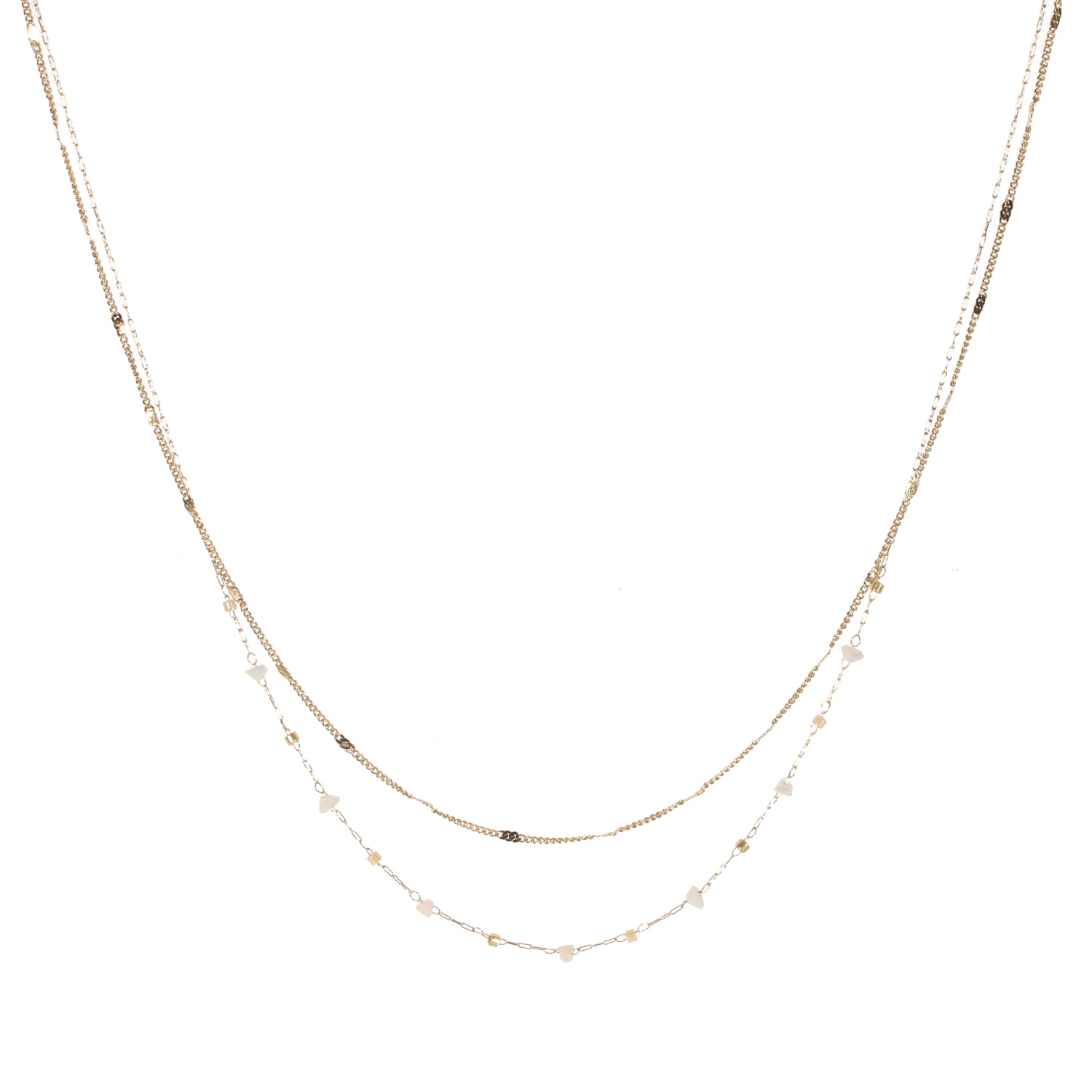 Description Collier double rangs composé d'une chaîne de 39 cm de long en acier doré, ainsi qu'une chaîne de 40 cm de long en acier doré avec perles de couleur blanche. Fermoir mousqueton avec 5 cm de rallonge. Cliquez sur une matière, un thème, une couleur ou une collection pour voir tous les articles associés.