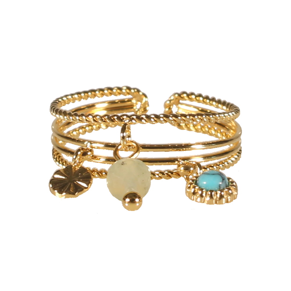 Description Bague multi rangs avec une pastille ronde en acier doré, un pendant serti d'une pierre d'imitation turquoise et une perle de couleur. Taille ajustable. Largeur 13 mm Matière(s) Acier , Rocaille . L'acier utilisé dans la bijouterie existe sous plusieurs qualités. Nous utilisons principalement la qualité 316L, qualité qui est utilisée en chirurgie. Cet acier est donc inoxydable et reste très résistant. Fermoir Aucun Couleur(s) dominante(s) Bleu , Doré Public Adolescent , Adulte . Genre Femme , Fille . Saison Indémodable . Cliquez sur une matière, un thème, une couleur ou une collection pour voir tous les articles associés.