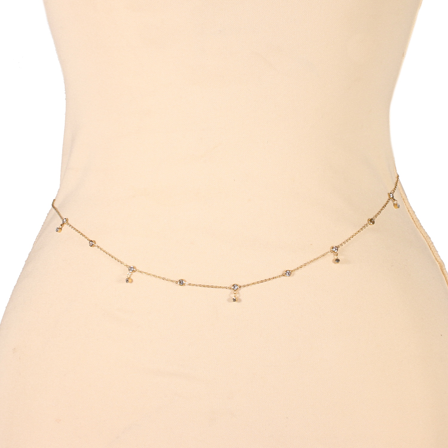 Chaîne tour de taille en acier doré avec cristaux sertis clos et pampilles serties de cristaux.