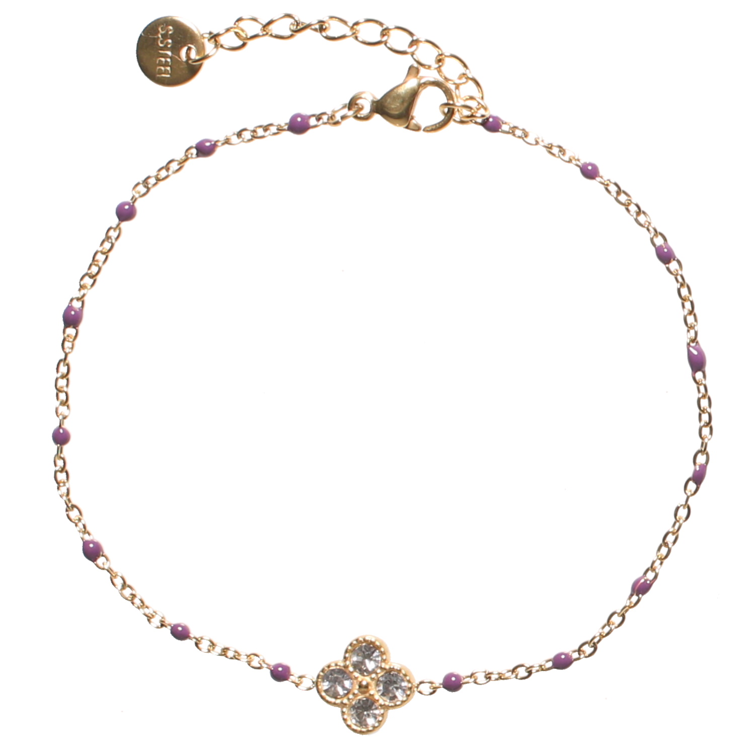 Bracelet composé d'une chaîne en acier doré, de perles en émail de couleur violet et d'un trèfle à quatre feuilles sertis de strass.<br/>Fermoir mousqueton avec 3 cm de rallonge. Perle Strass Trèfle  Adolescent Adulte Femme Fille Indémodable Nature Symboles Bracelet composé d'une chaîne en acier doré, de perles en émail de couleur violet et d'un trèfle à quatre feuilles sertis de strass.<br/>Fermoir mousqueton avec 3 cm de rallonge. Perle Strass Trèfle  Adolescent Adulte Femme Fille Indémodable Nature Symboles