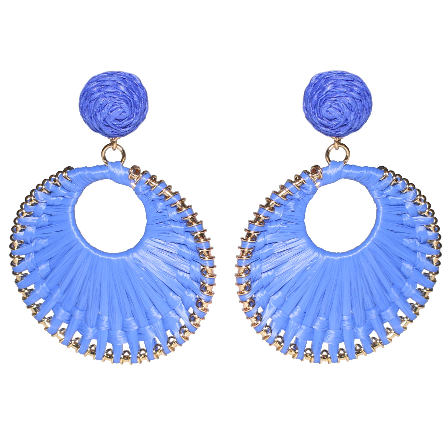 Boucles d'oreilles fantaisies pendantes en acier doré et paille artificielle de couleur bleue.