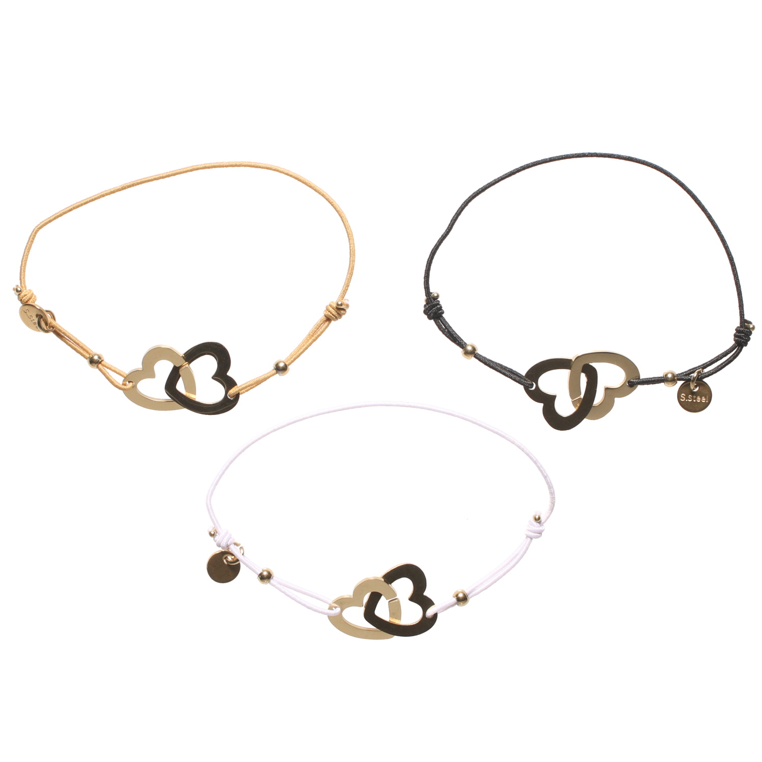 Lot de 3 bracelets composés d'un cordon élastique en coton de couleur et de deux cœurs entrelacés en acier doré.