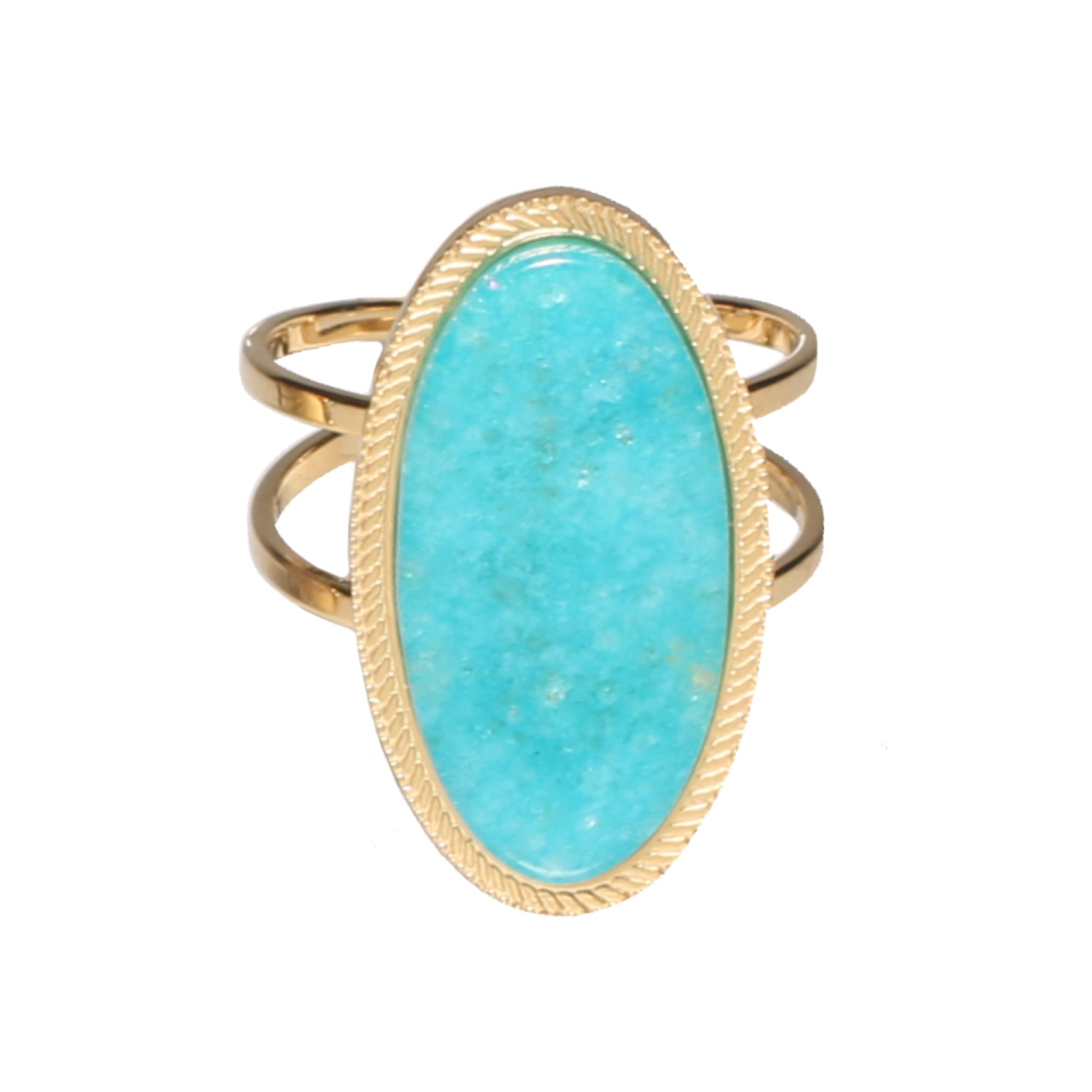 Description Bague ovale en acier doré pavée d'une pierre de couleur bleue turquoise. Taille ajustable. Largeur 25 mm Matière(s) Acier , Rocaille . L'acier utilisé dans la bijouterie existe sous plusieurs qualités. Nous utilisons principalement la qualité 316L, qualité qui est utilisée en chirurgie. Cet acier est donc inoxydable et reste très résistant. Fermoir Aucun Couleur(s) dominante(s) Bleu , Doré Public Adolescent , Adulte . Genre Femme , Fille . Saison Indémodable . Cliquez sur une matière, un thème, une couleur ou une collection pour voir tous les articles associés.