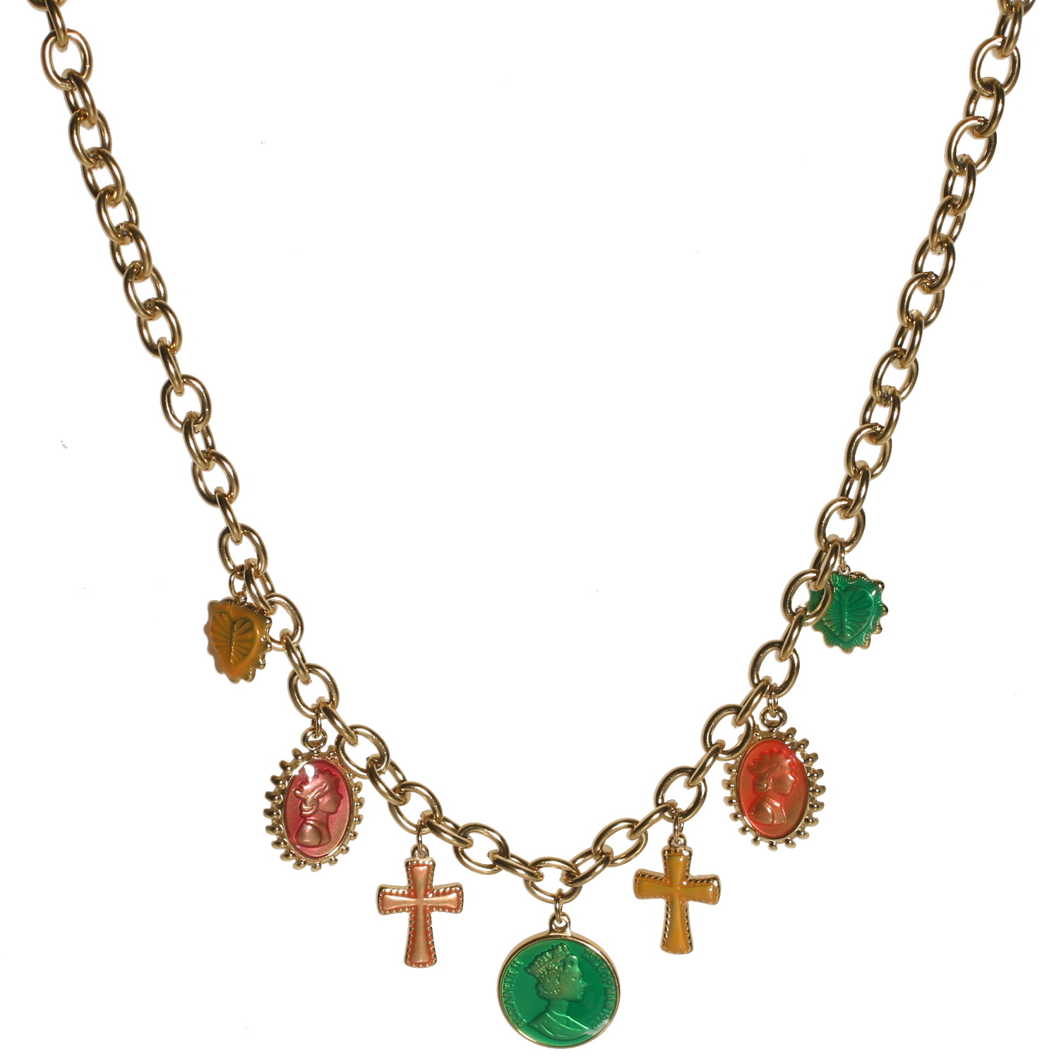 Collier composé d'une chaîne en acier doré et de breloques en forme de croix, de cœurs et médailles avec personnage et de pièce de monnaie en acier doré pavés d'émail de couleur.