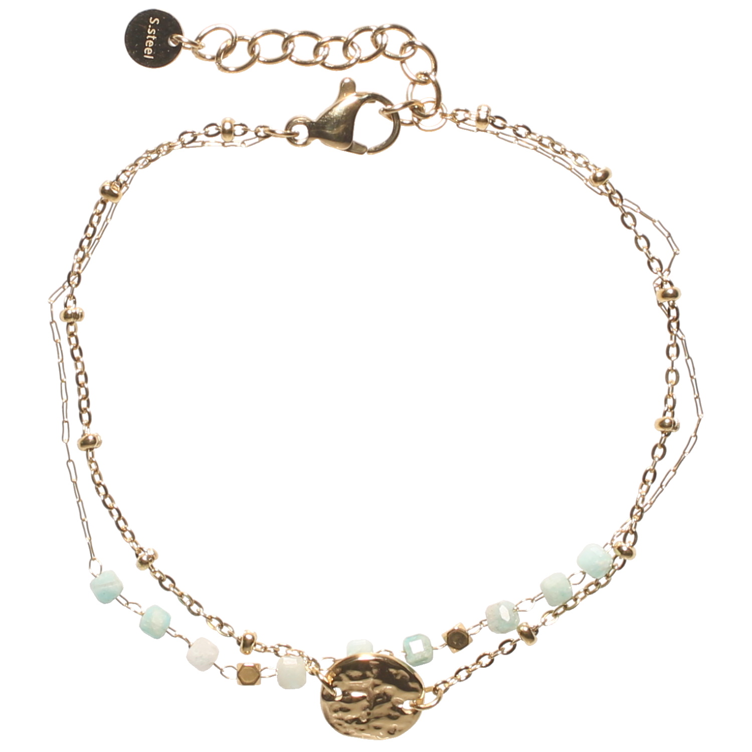 Description Bracelet double rangs composé d'une chaîne avec une pastille ronde martelée en acier doré, ainsi qu'une chaîne en acier doré avec des perles cubiques de couleur bleue turquoise. Fermoir mousqueton avec 3 cm de rallonge. Longueur 16+3 cm [Guide des tailles] Largeur 10 mm Matière(s) Acier , Rocaille . L'acier utilisé dans la bijouterie existe sous plusieurs qualités. Nous utilisons principalement la qualité 316L, qualité qui est utilisée en chirurgie. Cet acier est donc inoxydable et reste très résistant. Fermoir Mousqueton Couleur(s) dominante(s) Bleu , Doré Public Adolescent , Adulte . Genre Femme , Fille . Saison Indémodable . Cliquez sur une matière, un thème, une couleur ou une collection pour voir tous les articles associés.