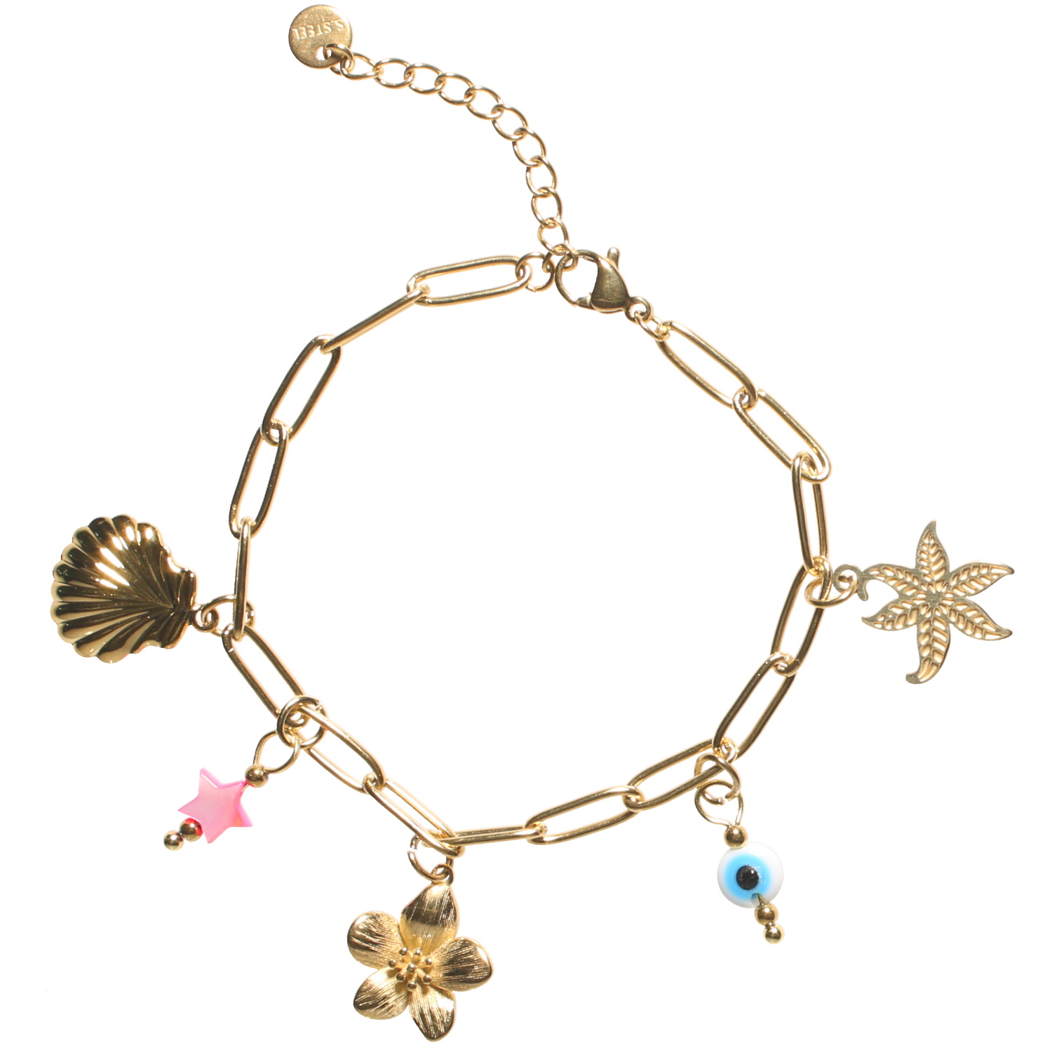 Bracelet composé d'une chaîne avec breloques étoile de mer, coquillage et fleur en acier doré et de pendants étoile en nacre rose et d'un œil de Turquie.
