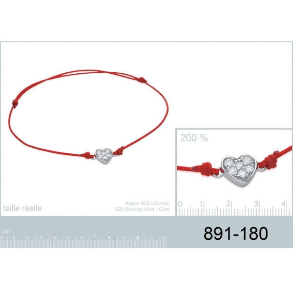 Bracelet en argent 925/000 rhodié, oxyde de zirconium et fil de coton rouge.