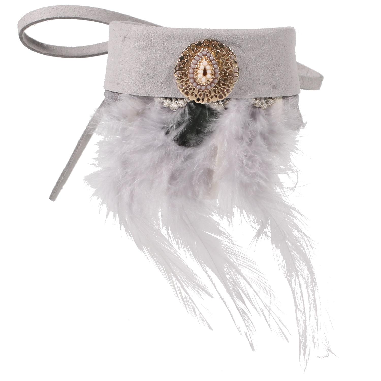 Bracelet/Chaîne cheville fantaisie en suédine, textile, métal doré, plume et résine.